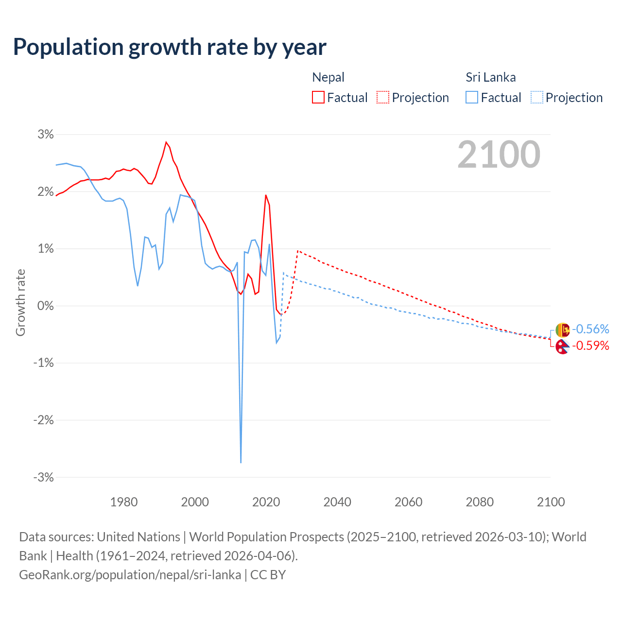 - For the last 10 years, Nepal has had an average growth rate of +0.66% per year vs +0.57% in Sri Lanka.