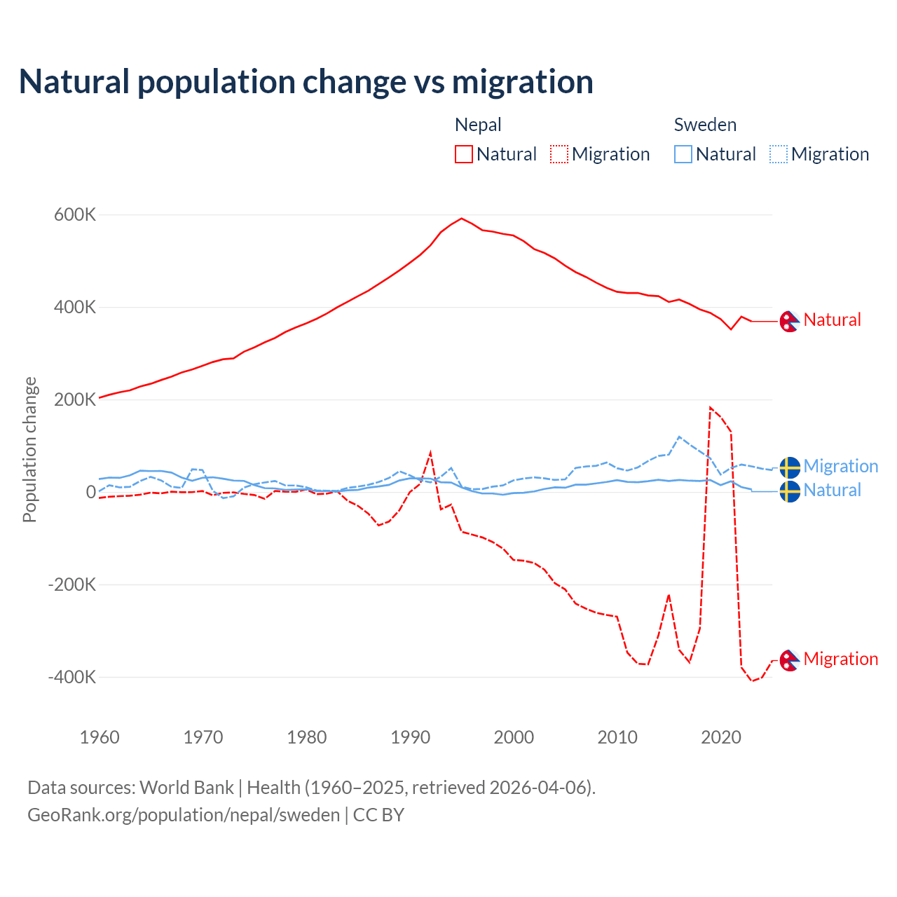 Over the last 10 years, 67.9% of the population change in Nepal is from natural causes (a gain of 3,909,749 people) and 32.1% is from migration (a loss of 1,851,664 people). In Sweden 21.4% is from natural causes (a gain of 201,900 people) and 78.6% is from migration (a gain of 743,642 people).