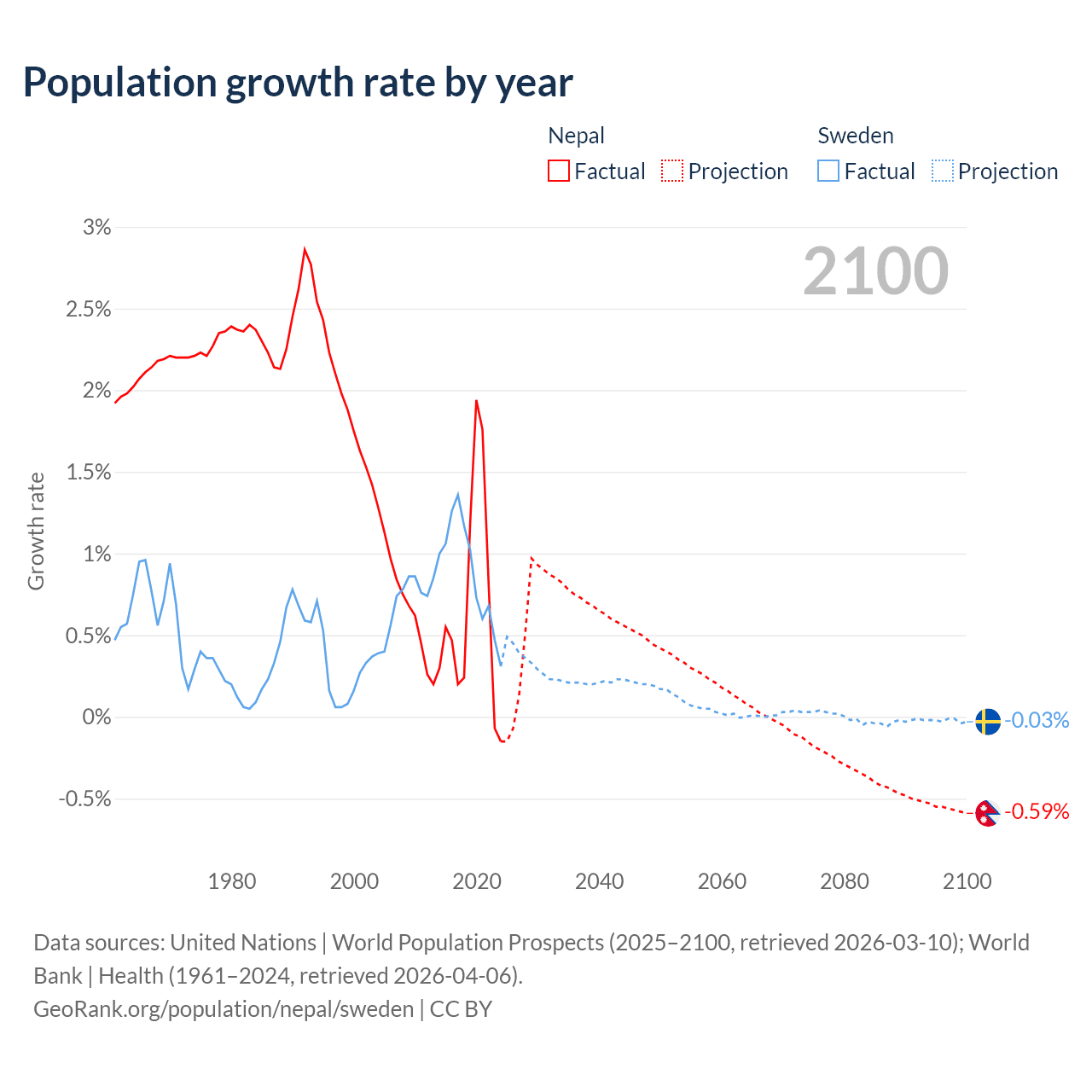 - For the last 10 years, Nepal has had an average growth rate of +0.66% per year vs +0.88% in Sweden.