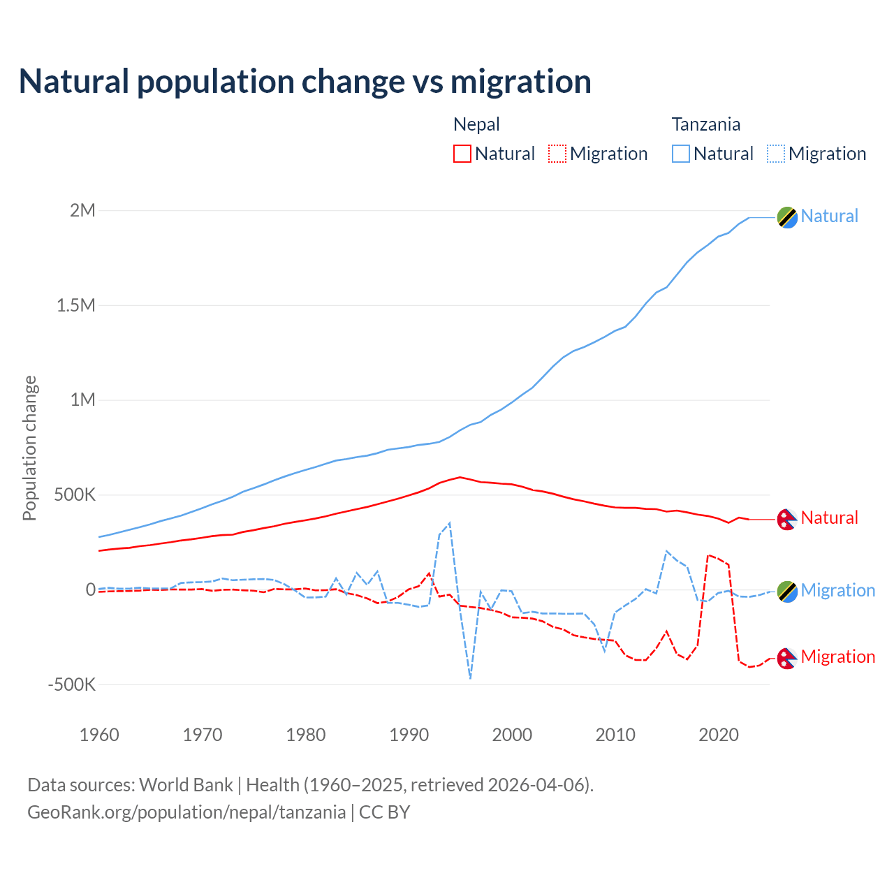 Over the last 10 years, 67.9% of the population change in Nepal is from natural causes (a gain of 3,909,749 people) and 32.1% is from migration (a loss of 1,851,664 people). In Tanzania 98.7% is from natural causes (a gain of 17,769,541 people) and 1.27% is from migration (a gain of 229,466 people).