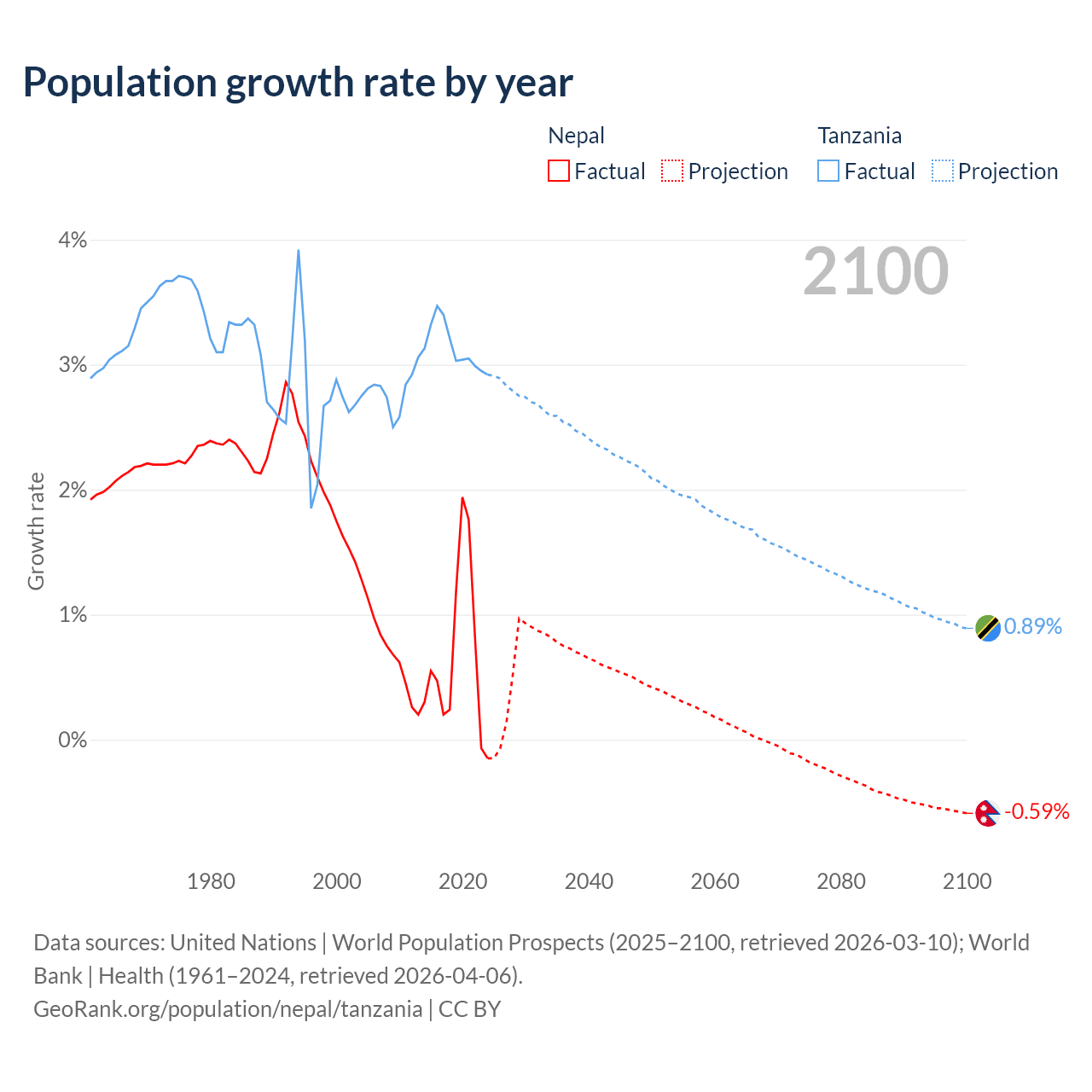 - For the last 10 years, Nepal has had an average growth rate of +0.66% per year vs +3.13% in Tanzania.