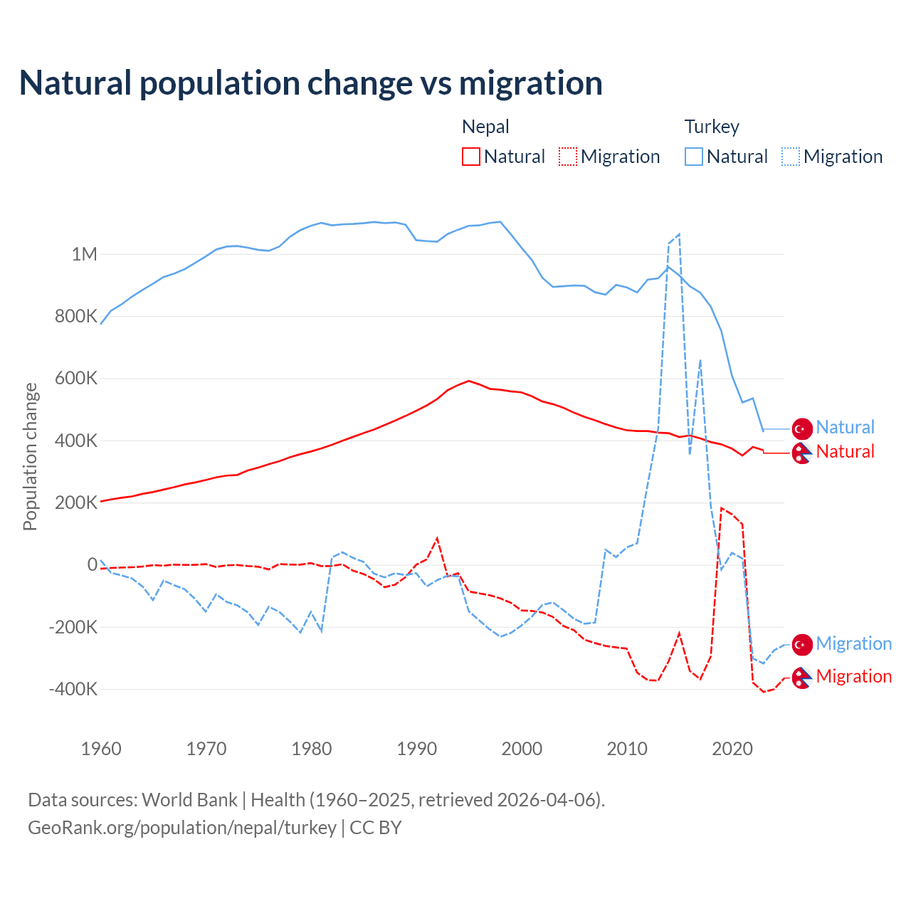Over the last 10 years, 67.9% of the population change in Nepal is from natural causes (a gain of 3,909,749 people) and 32.1% is from migration (a loss of 1,851,664 people). In Turkey 73% is from natural causes (a gain of 7,333,352 people) and 27% is from migration (a gain of 2,718,916 people).