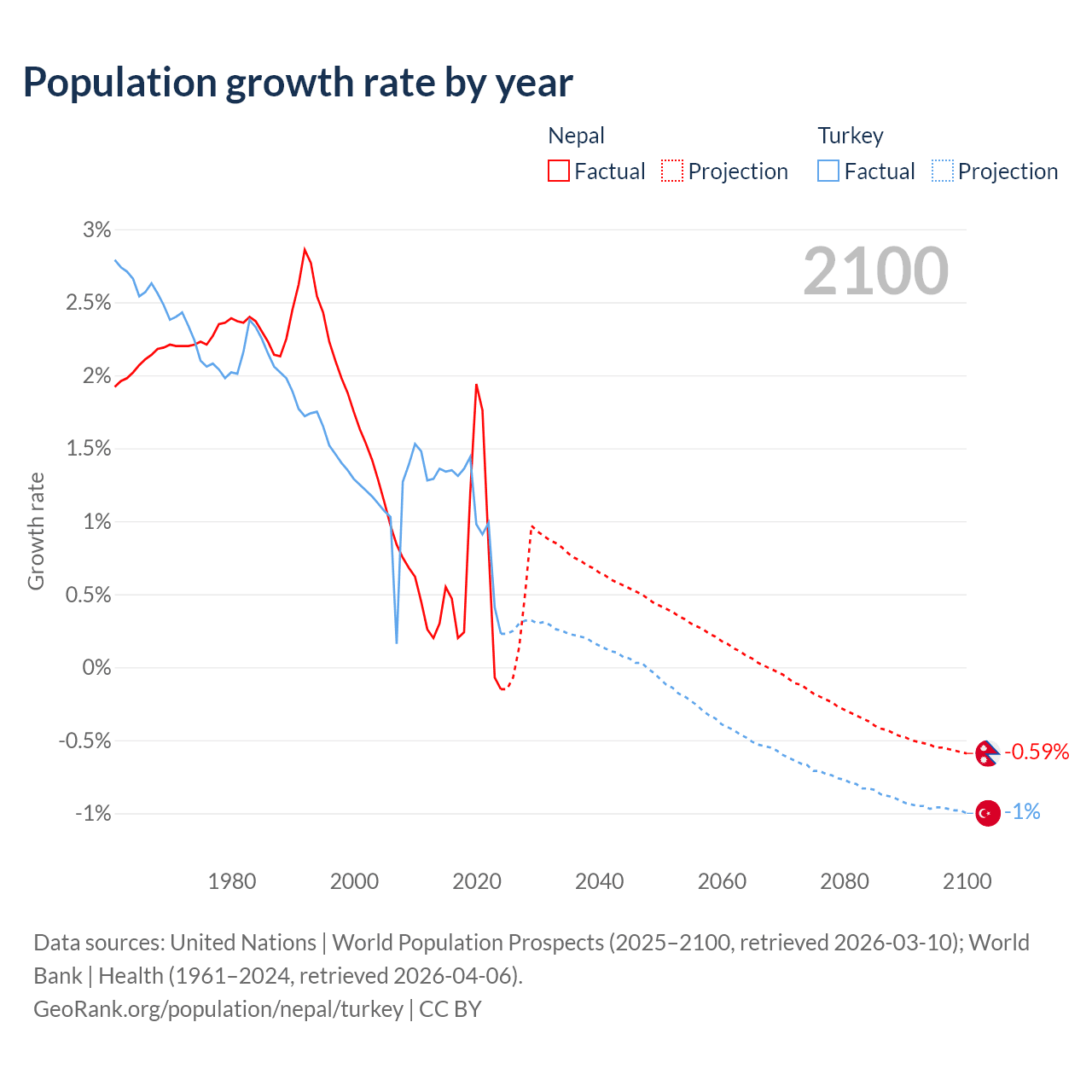 - For the last 10 years, Nepal has had an average growth rate of +0.66% per year vs +1.06% in Turkey.