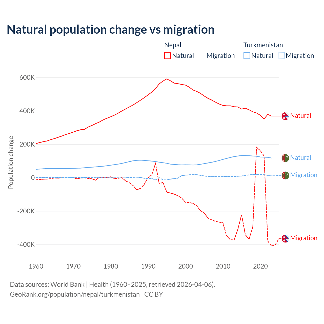 Over the last 10 years, 67.9% of the population change in Nepal is from natural causes (a gain of 3,909,749 people) and 32.1% is from migration (a loss of 1,851,664 people). In Turkmenistan 89.2% is from natural causes (a gain of 1,270,228 people) and 10.8% is from migration (a gain of 154,379 people).