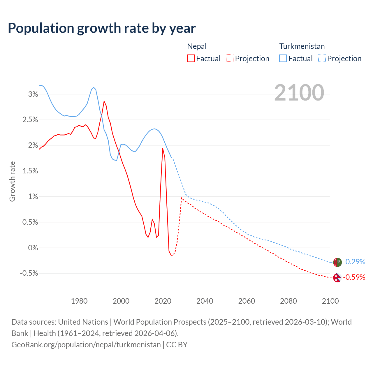 - For the last 10 years, Nepal has had an average growth rate of +0.66% per year vs +2.14% in Turkmenistan.