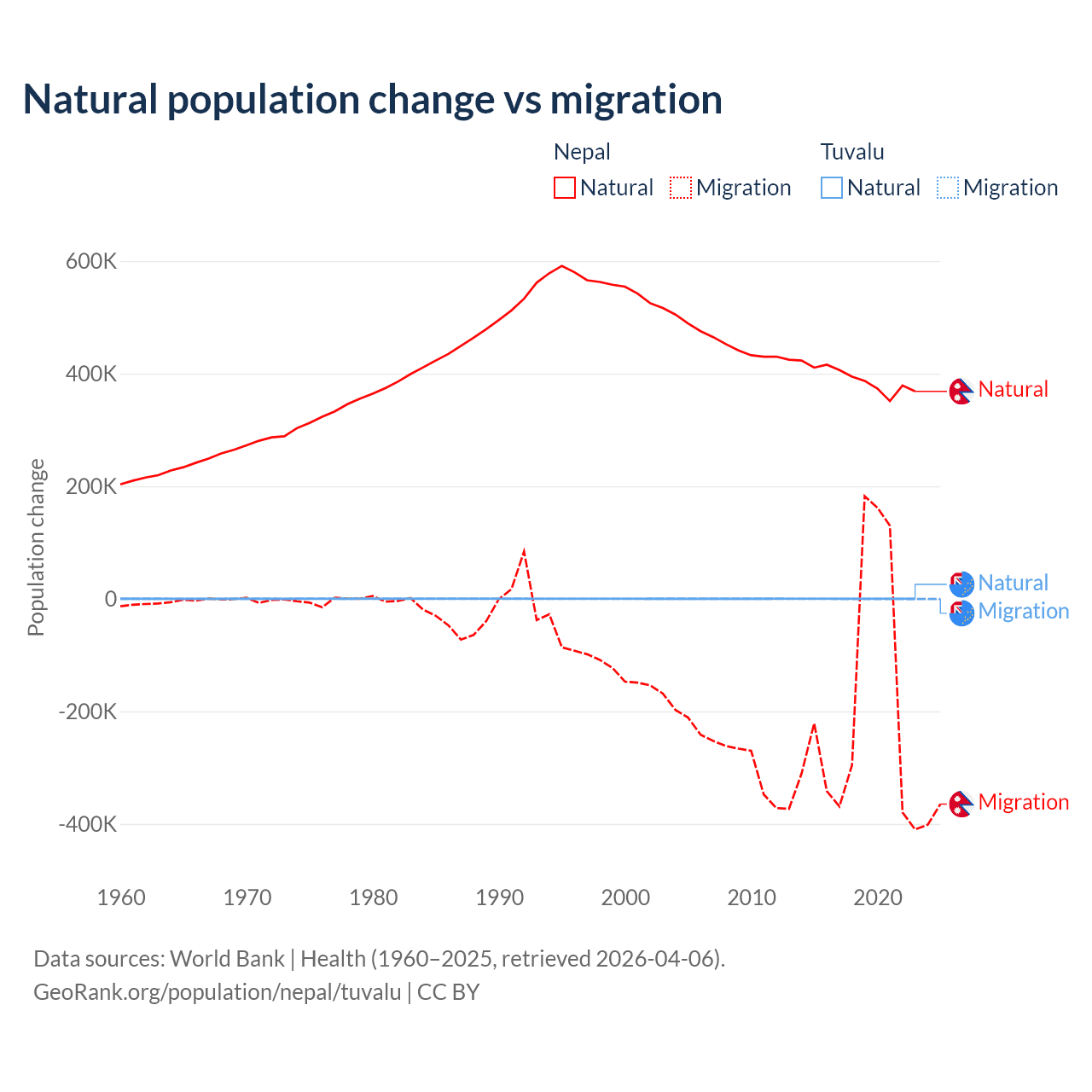 Over the last 10 years, 67.9% of the population change in Nepal is from natural causes (a gain of 3,909,749 people) and 32.1% is from migration (a loss of 1,851,664 people). In Tuvalu 35.5% is from natural causes (a gain of 1,556 people) and 64.5% is from migration (a loss of 2,827 people).
