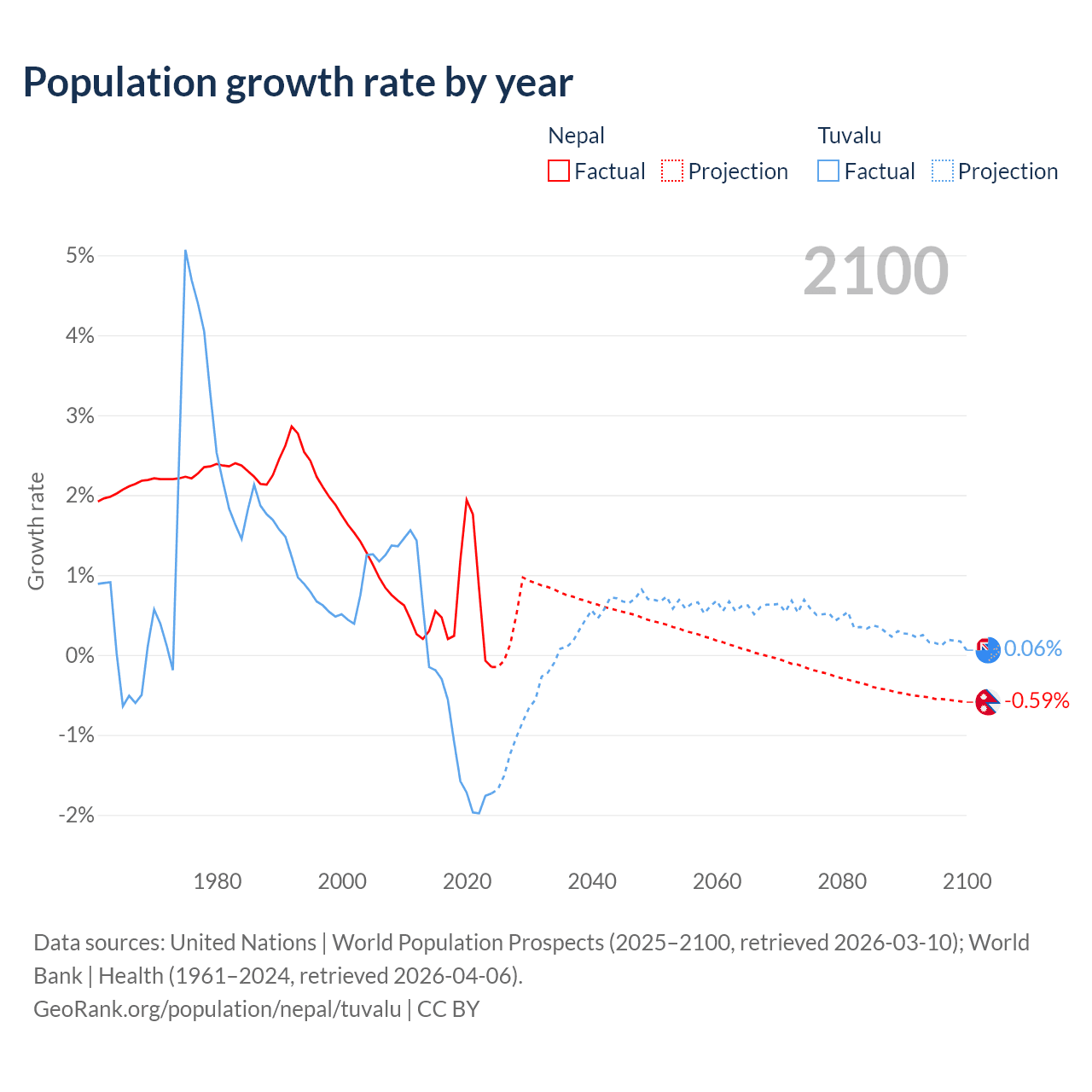 - For the last 10 years, Nepal has had an average growth rate of +0.66% per year vs -1.19% in Tuvalu.