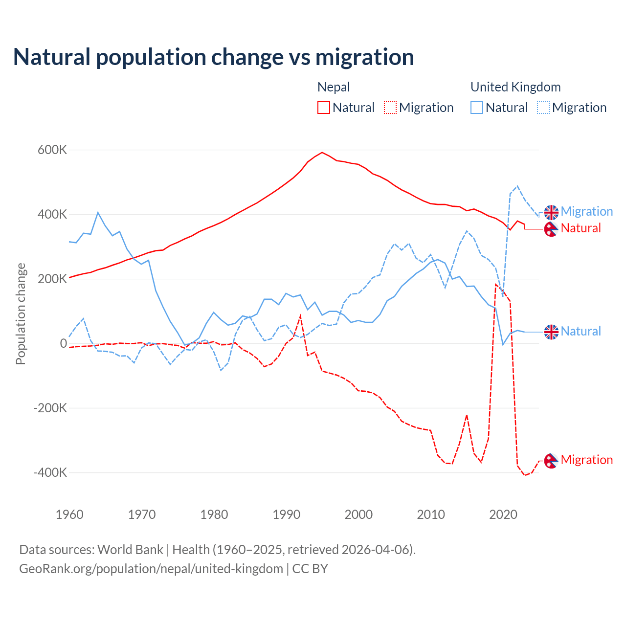 Over the last 10 years, 67.9% of the population change in Nepal is from natural causes (a gain of 3,909,749 people) and 32.1% is from migration (a loss of 1,851,664 people). In the United Kingdom 23.9% is from natural causes (a gain of 1,033,129 people) and 76.1% is from migration (a gain of 3,283,101 people).