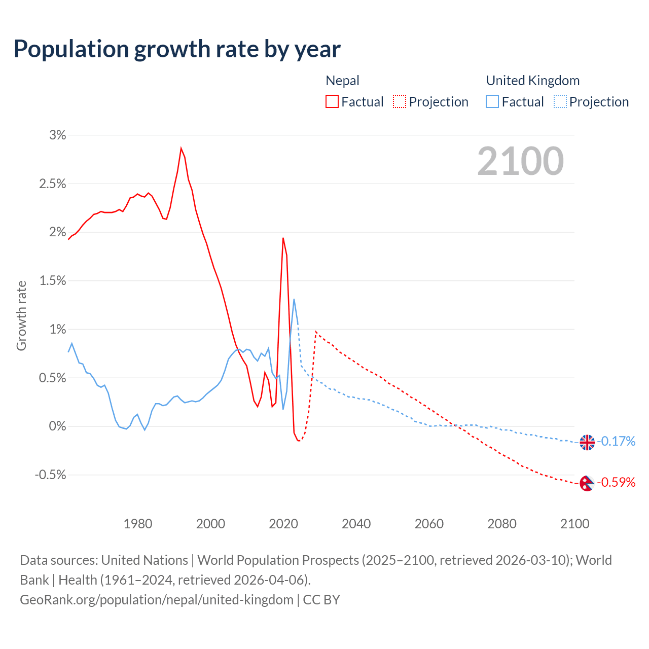 - For the last 10 years, Nepal has had an average growth rate of +0.66% per year vs +0.7% in the United Kingdom.