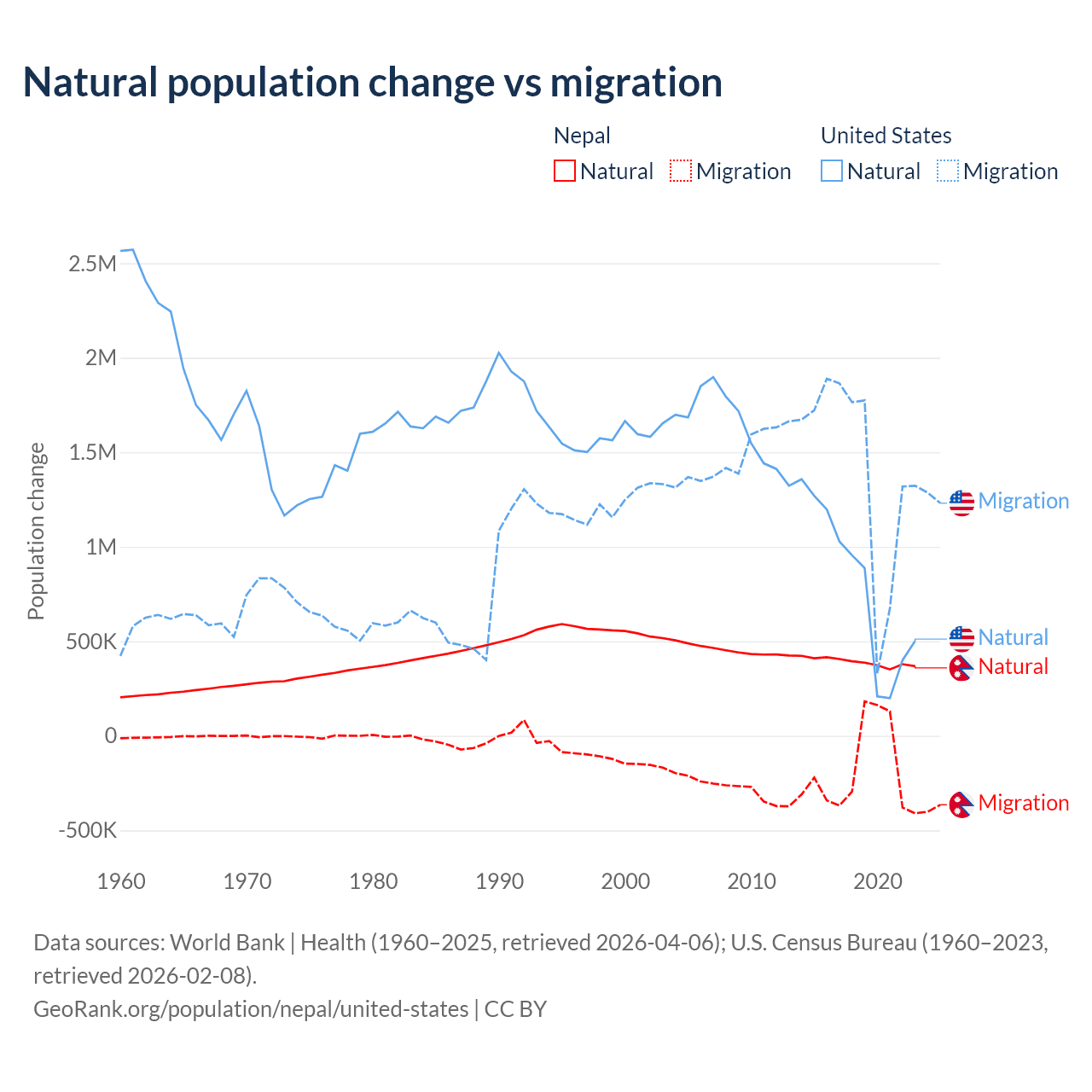 Data sources: World Bank | Health (1960–2025, retrieved 2026-04-06); U.S. Census Bureau (1960–2023, retrieved 2026-02-08).