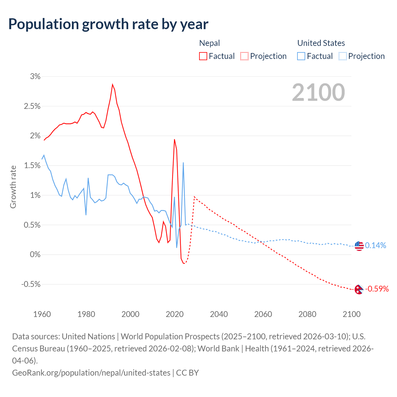 Data sources: World Bank | Health (1960–2024, retrieved 2026-04-06); United Nations | World Population Prospects (1960–2026, retrieved 2026-03-10); U.S. Census Bureau (1960–2025, retrieved 2026-02-08); Central Intelligence Agency (CIA) (2000–2019, retrieved 2026-02-20).