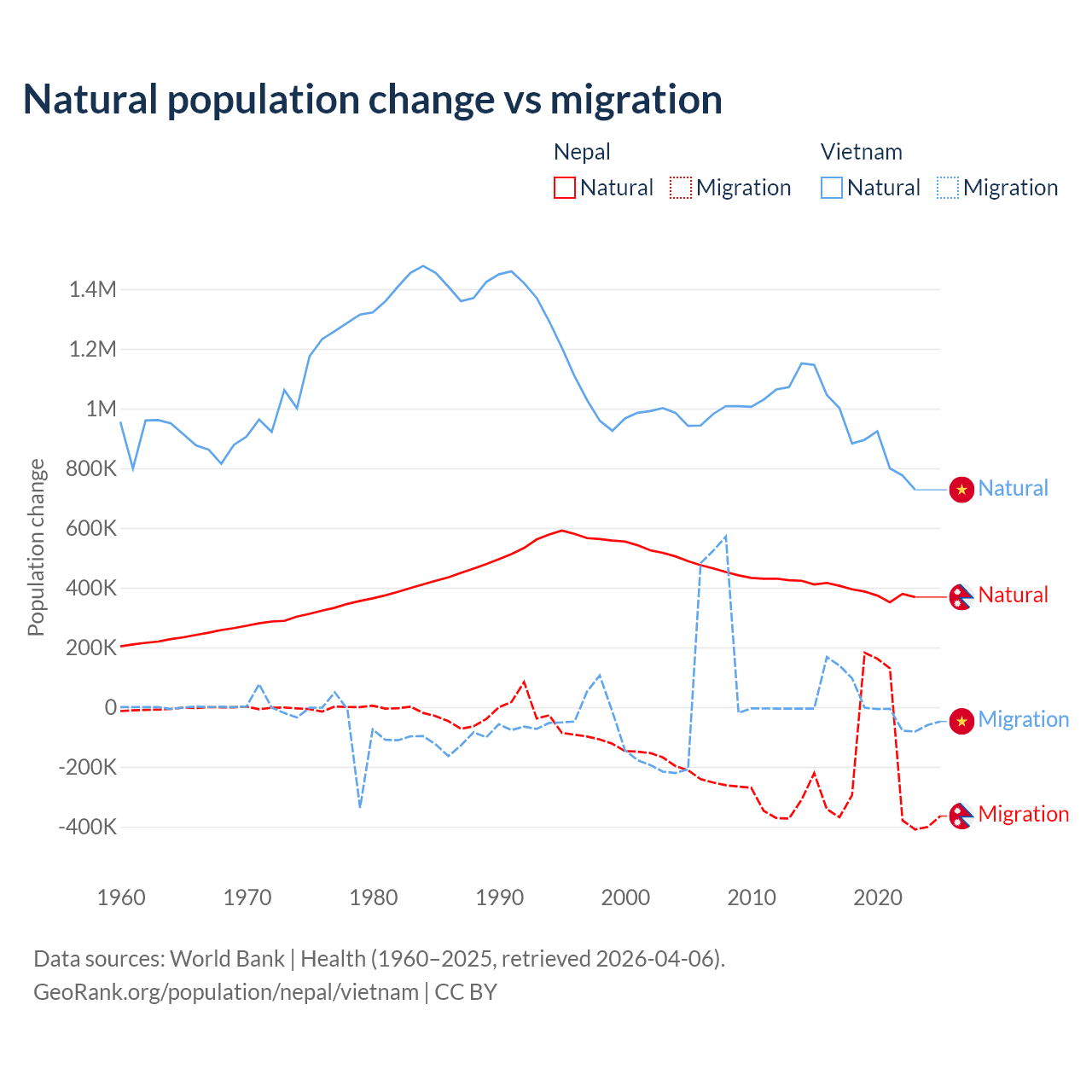 Over the last 10 years, 67.9% of the population change in Nepal is from natural causes (a gain of 3,909,749 people) and 32.1% is from migration (a loss of 1,851,664 people). In Vietnam 97.7% is from natural causes (a gain of 9,349,756 people) and 2.29% is from migration (a gain of 219,073 people).