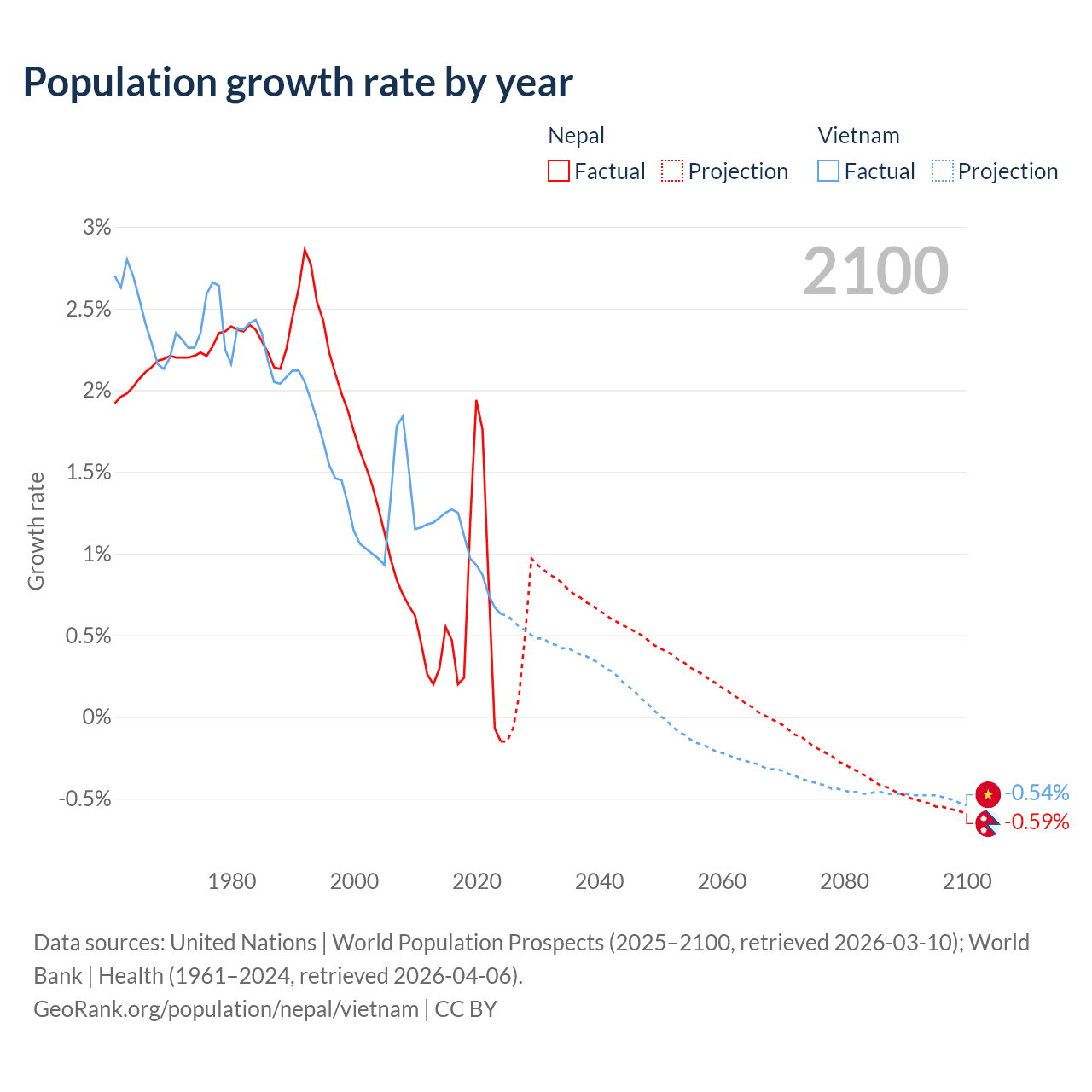 Data sources: World Bank | Health (1960–2024, retrieved 2026-04-06); United Nations | World Population Prospects (1960–2026, retrieved 2026-03-10); U.S. Census Bureau (1960–2025, retrieved 2026-02-08); Central Intelligence Agency (CIA) (2000–2019, retrieved 2026-02-20).