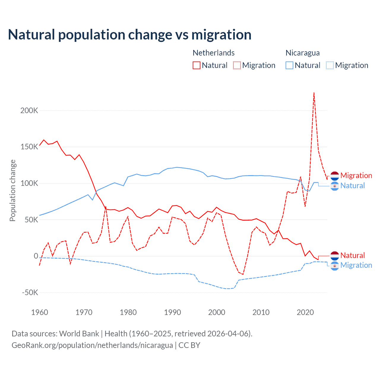 Over the last 10 years, 11.8% of the population change in the Netherlands is from natural causes (a gain of 134,554 people) and 88.2% is from migration (a gain of 1,006,495 people). In Nicaragua 85.5% is from natural causes (a gain of 1,017,084 people) and 14.5% is from migration (a loss of 172,078 people).