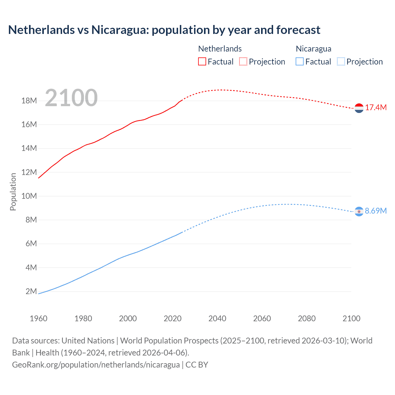 The latest officially reported population of the Netherlands was 17,993,485 in 2024 vs 6,916,140 people in Nicaragua in 2024. In 2026, based on the adjusted UN estimation, the current Netherlands' population is 18,252,623 people compared to 7,124,343 in Nicaragua.