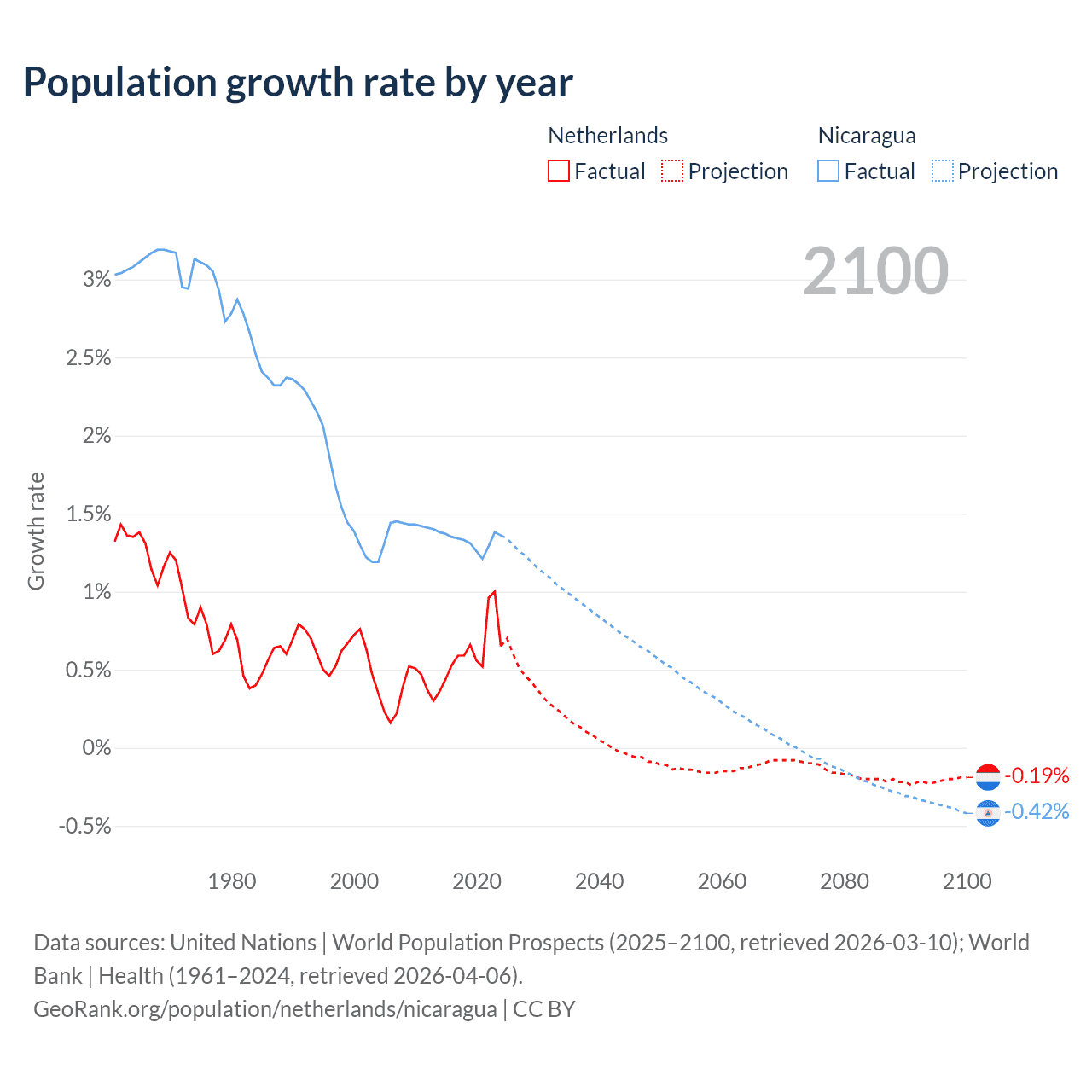 - For the last 10 years, the Netherlands has had an average growth rate of +0.62% per year vs +1.33% in Nicaragua.
