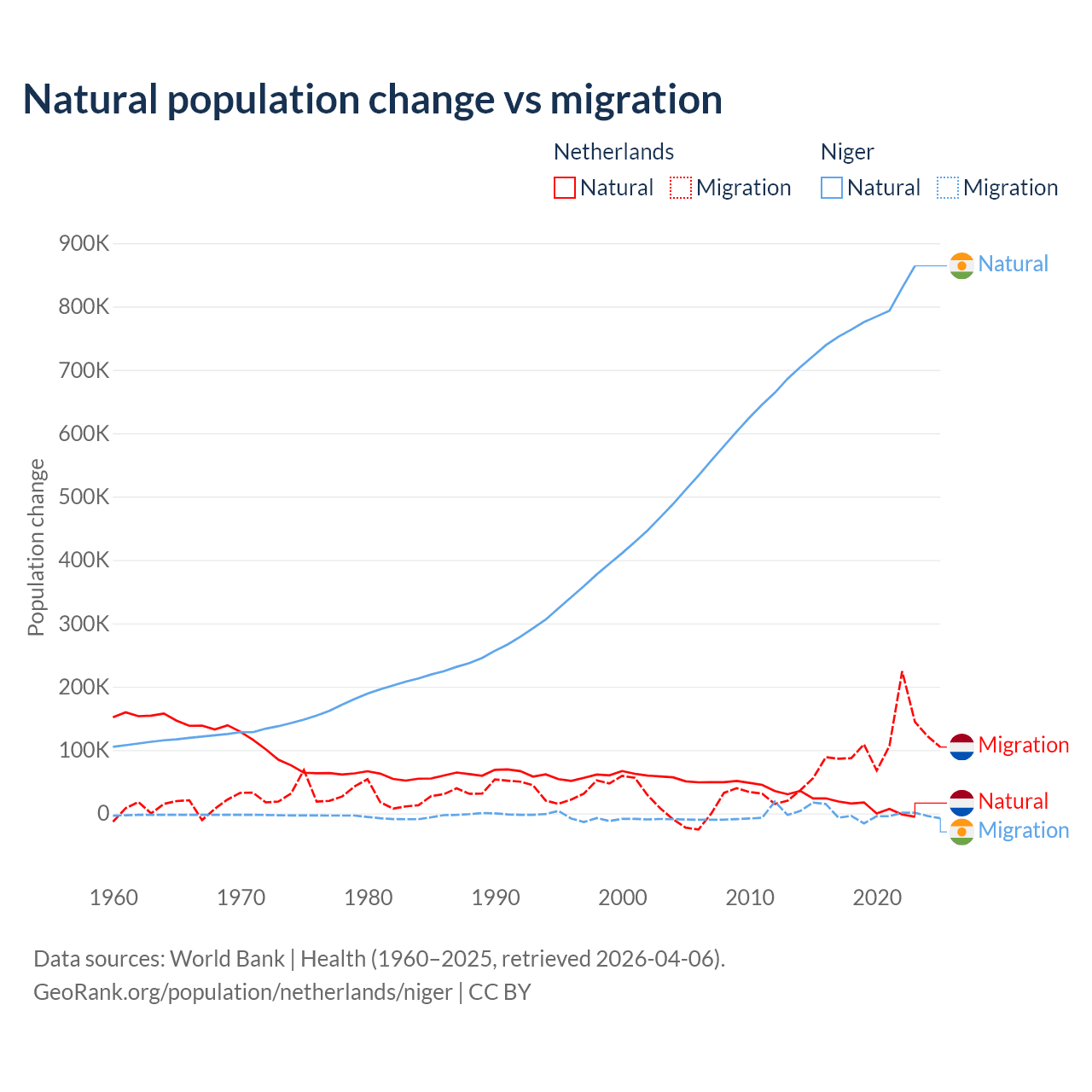 Over the last 10 years, 11.8% of the population change in the Netherlands is from natural causes (a gain of 134,554 people) and 88.2% is from migration (a gain of 1,006,495 people). In Niger 100% is from natural causes (a gain of 7,728,287 people) and 0.03% is from migration (a gain of 2,520 people).