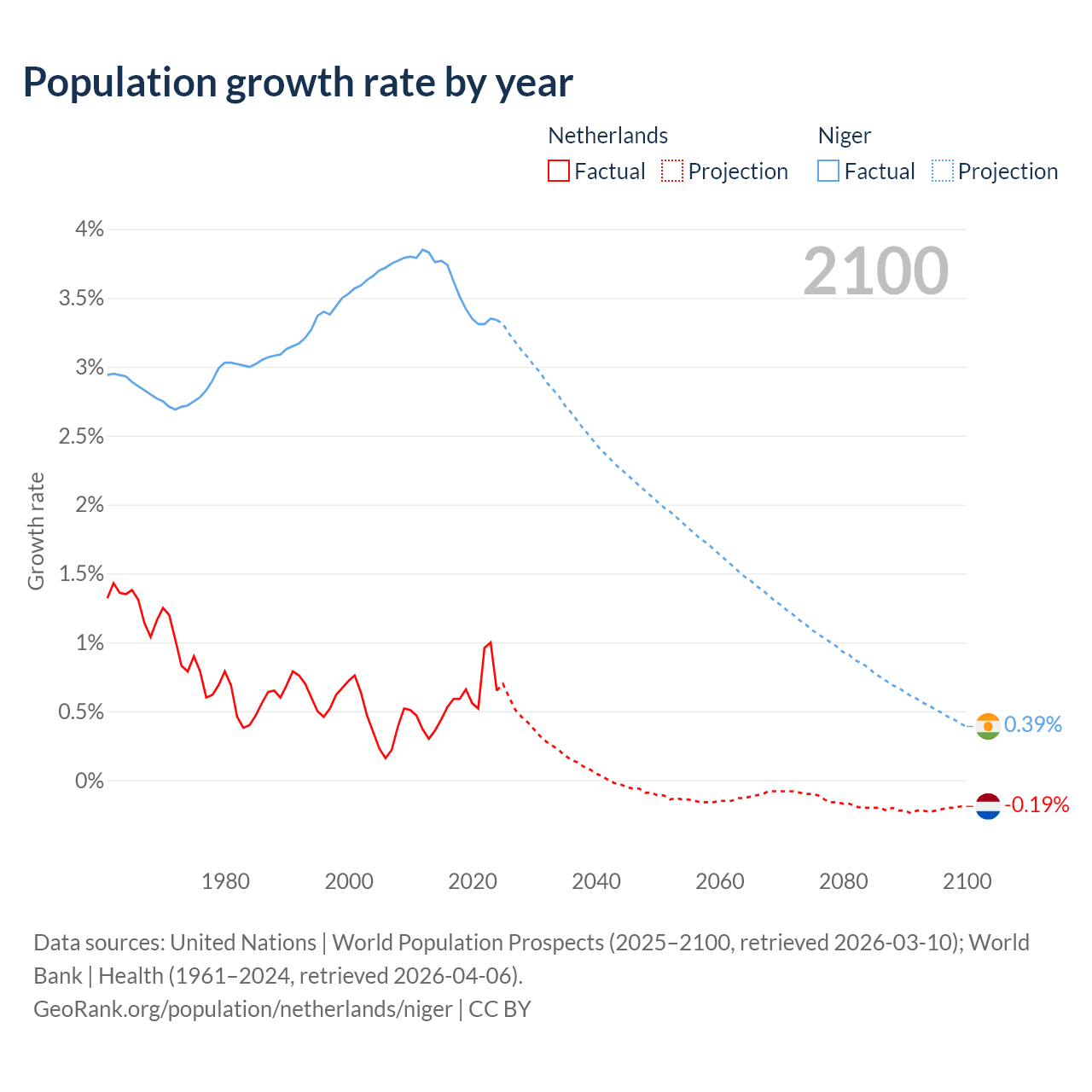 - For the last 10 years, the Netherlands has had an average growth rate of +0.62% per year vs +3.5% in Niger.