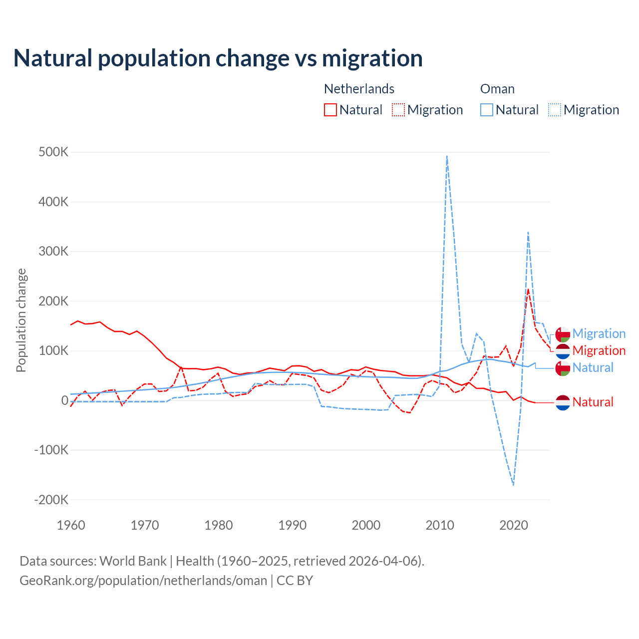 Over the last 10 years, 11.8% of the population change in the Netherlands is from natural causes (a gain of 134,554 people) and 88.2% is from migration (a gain of 1,006,495 people). In Oman 61.6% is from natural causes (a gain of 763,049 people) and 38.4% is from migration (a gain of 475,565 people).