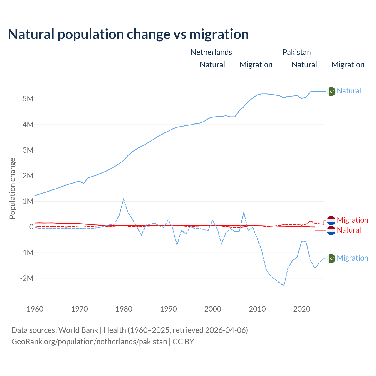 Over the last 10 years, 11.8% of the population change in the Netherlands is from natural causes (a gain of 134,554 people) and 88.2% is from migration (a gain of 1,006,495 people). In Pakistan 77.8% is from natural causes (a gain of 51,255,404 people) and 22.2% is from migration (a loss of 14,629,055 people).