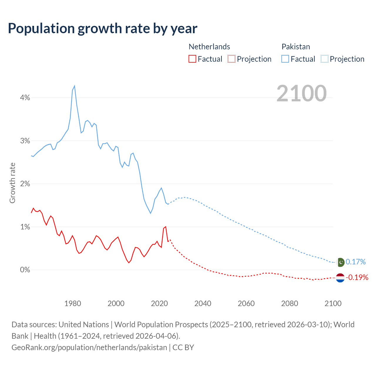 - For the last 10 years, the Netherlands has had an average growth rate of +0.62% per year vs +1.6% in Pakistan.