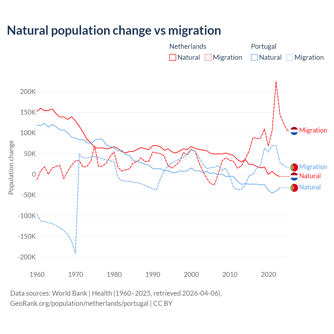 Over the last 10 years, 11.8% of the population change in the Netherlands is from natural causes (a gain of 134,554 people) and 88.2% is from migration (a gain of 1,006,495 people). In Portugal 51% is from natural causes (a loss of 302,748 people) and 49% is from migration (a gain of 290,554 people).