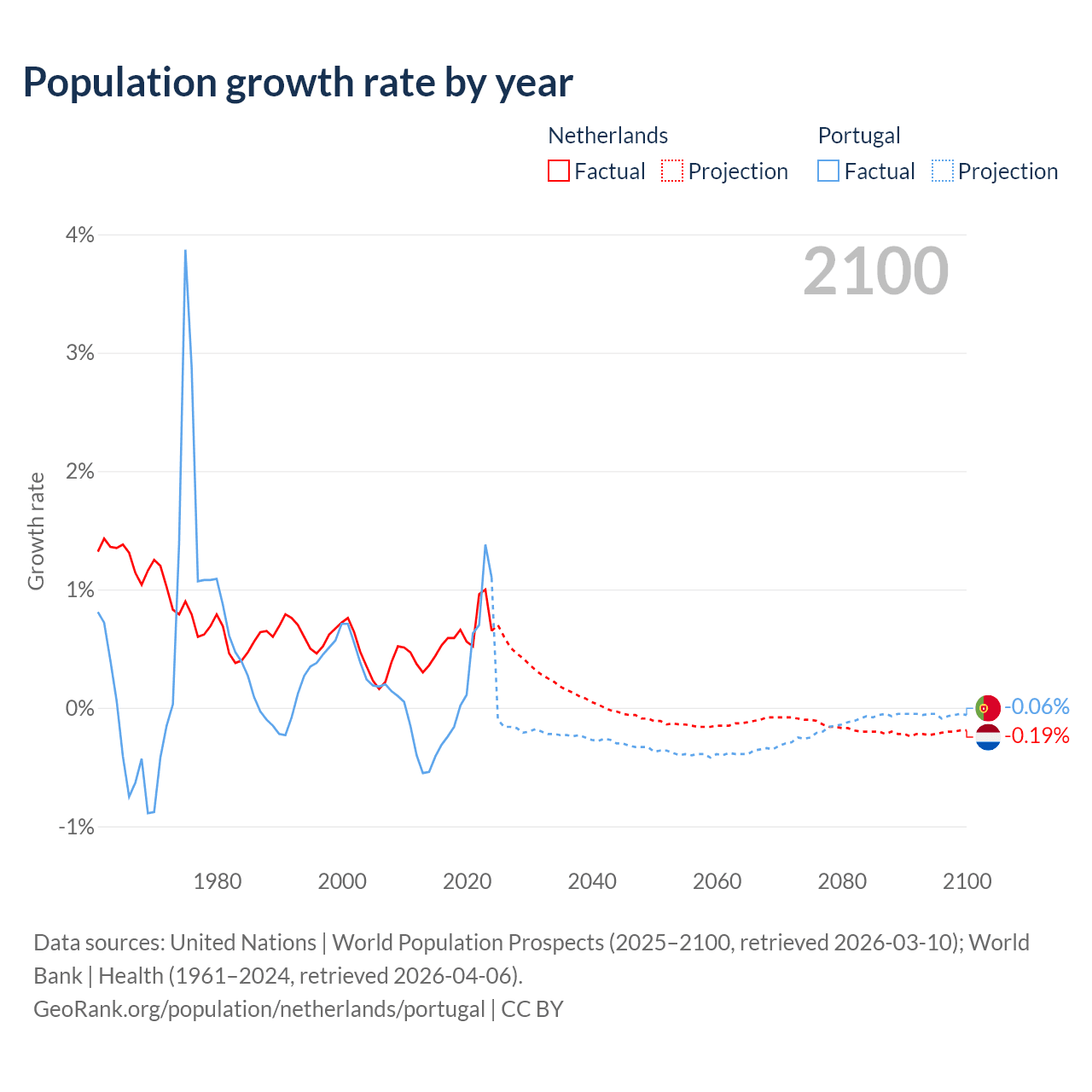 - For the last 10 years, the Netherlands has had an average growth rate of +0.62% per year vs +0.21% in Portugal.