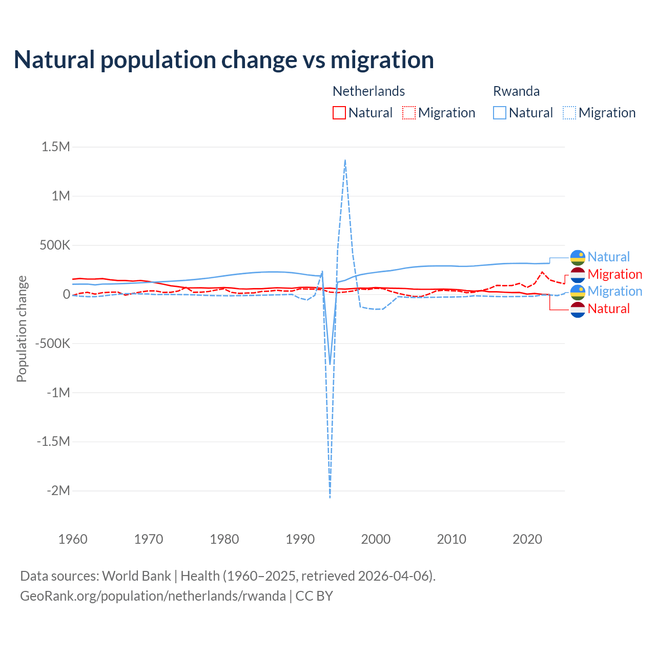 Over the last 10 years, 11.8% of the population change in the Netherlands is from natural causes (a gain of 134,554 people) and 88.2% is from migration (a gain of 1,006,495 people). In Rwanda 93.8% is from natural causes (a gain of 3,081,296 people) and 6.18% is from migration (a loss of 203,035 people).