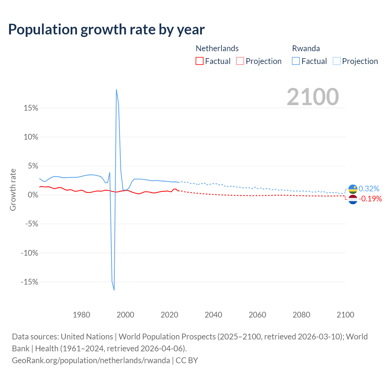 - For the last 10 years, the Netherlands has had an average growth rate of +0.62% per year vs +2.31% in Rwanda.