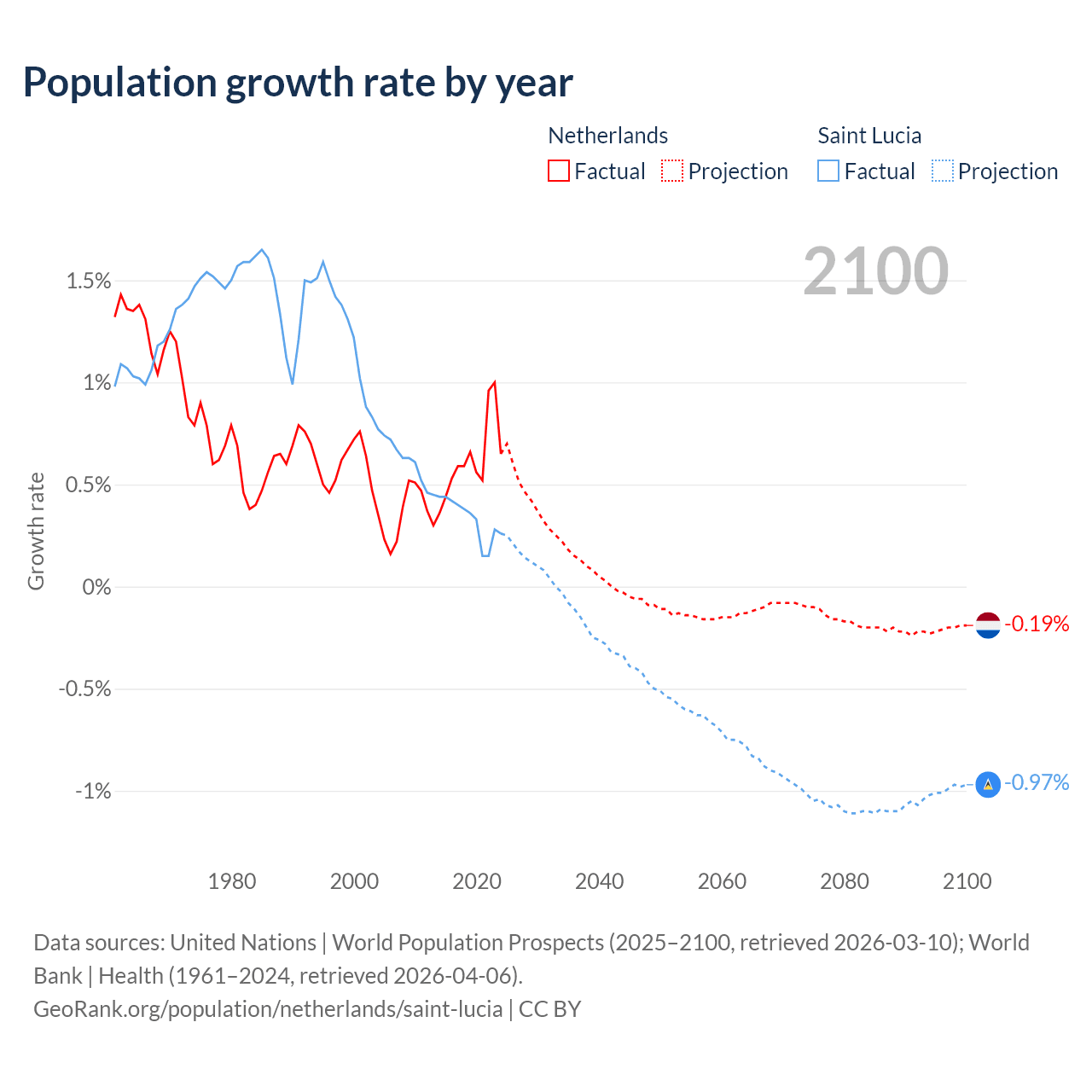 - For the last 10 years, the Netherlands has had an average growth rate of +0.62% per year vs +0.33% in Saint Lucia.