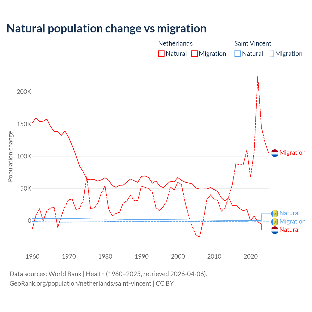 Over the last 10 years, 11.8% of the population change in the Netherlands is from natural causes (a gain of 134,554 people) and 88.2% is from migration (a gain of 1,006,495 people). In Saint Vincent 21.2% is from natural causes (a gain of 2,525 people) and 78.8% is from migration (a loss of 9,393 people).