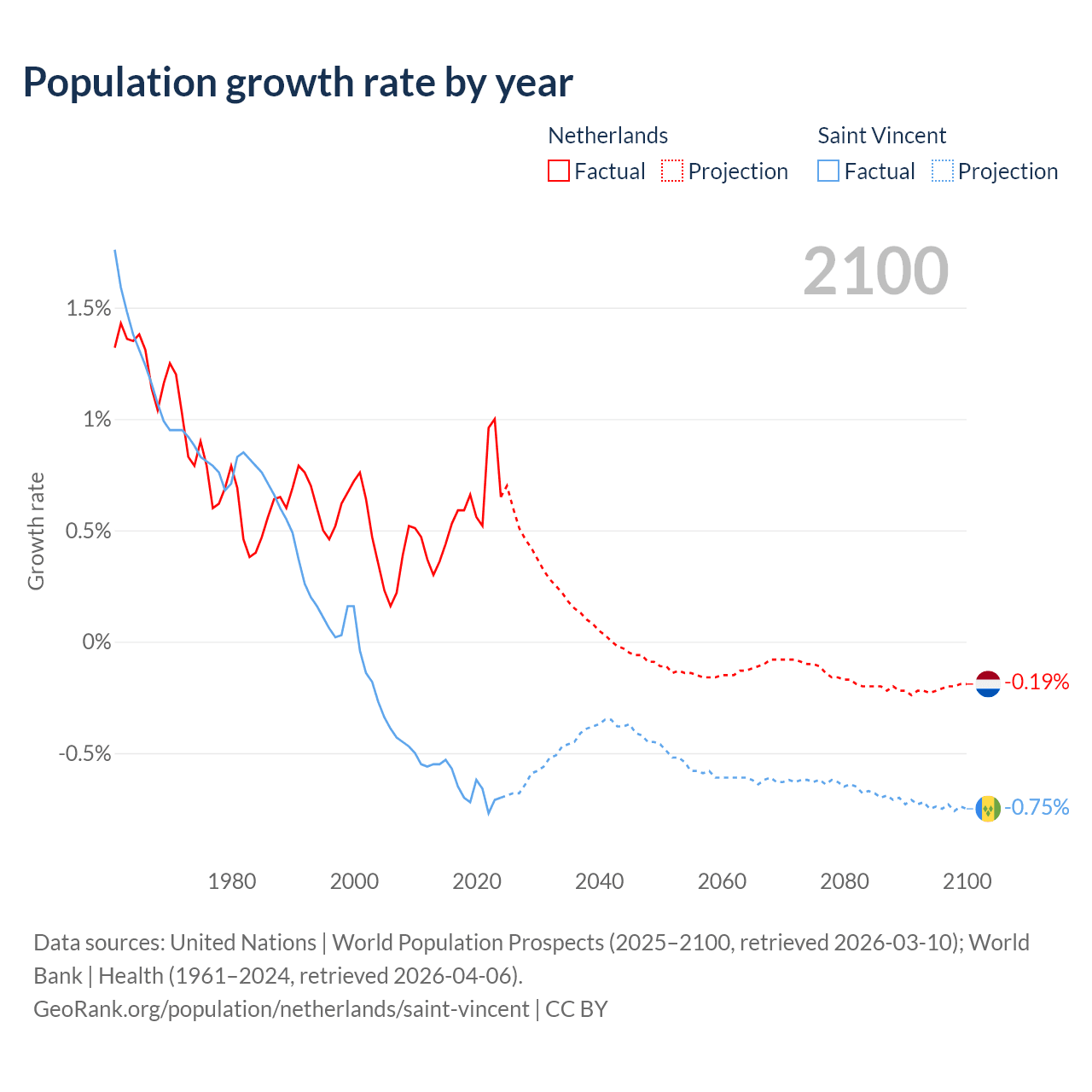 - For the last 10 years, the Netherlands has had an average growth rate of +0.62% per year vs -0.65% in Saint Vincent.