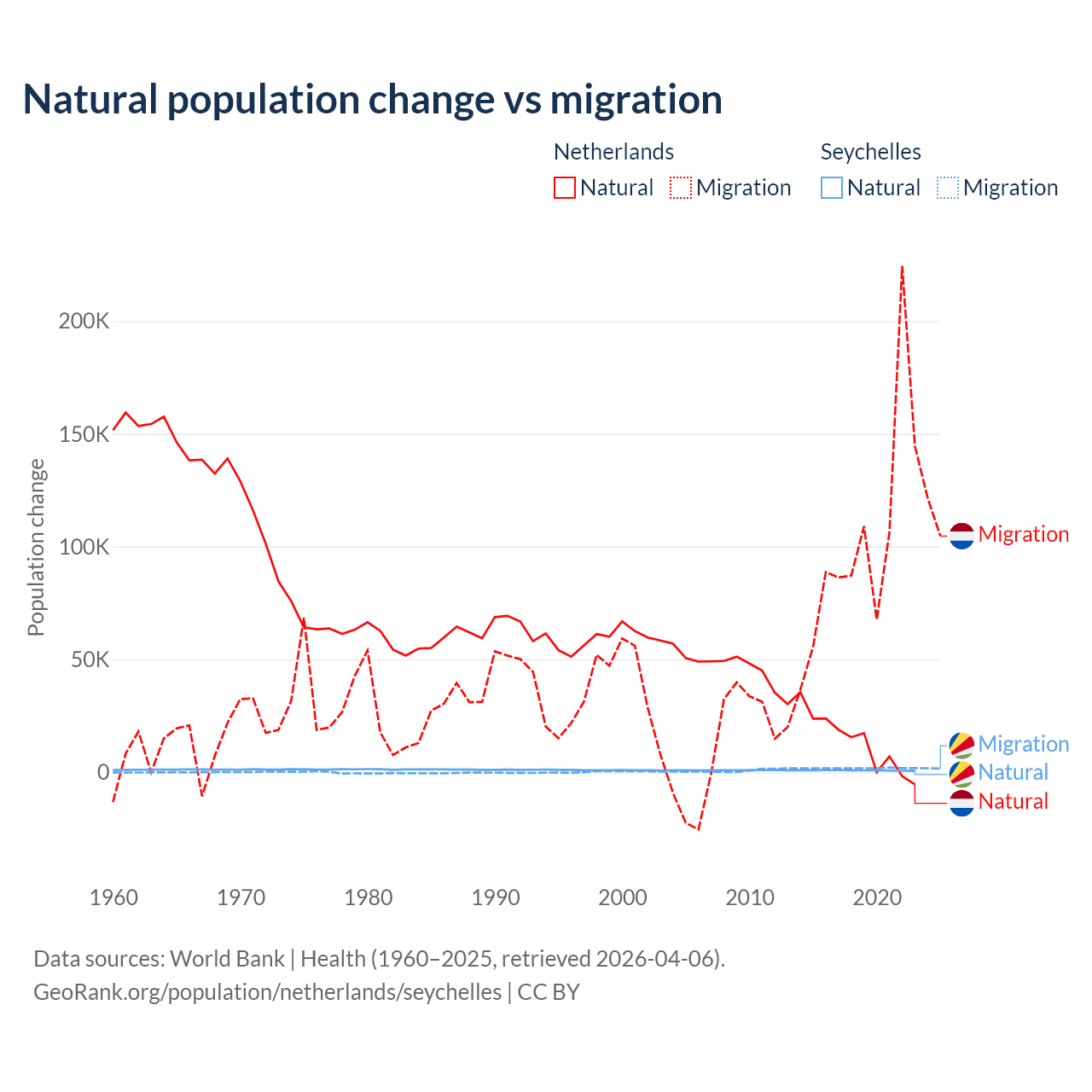 Over the last 10 years, 11.8% of the population change in the Netherlands is from natural causes (a gain of 134,554 people) and 88.2% is from migration (a gain of 1,006,495 people). In the Seychelles 31.4% is from natural causes (a gain of 8,122 people) and 68.6% is from migration (a gain of 17,748 people).