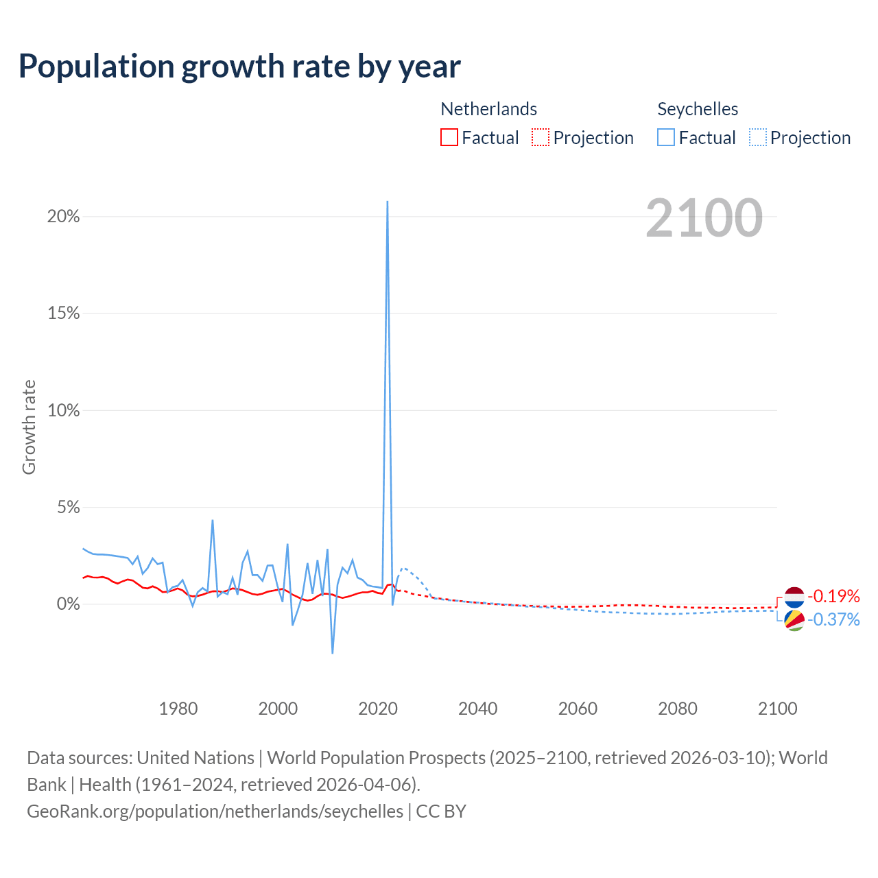 - For the last 10 years, the Netherlands has had an average growth rate of +0.62% per year vs +2.9% in the Seychelles.
