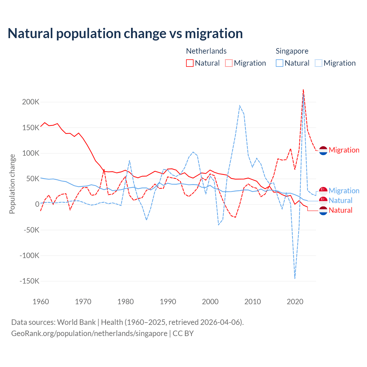 Over the last 10 years, 11.8% of the population change in the Netherlands is from natural causes (a gain of 134,554 people) and 88.2% is from migration (a gain of 1,006,495 people). In Singapore 54.8% is from natural causes (a gain of 195,953 people) and 45.2% is from migration (a gain of 161,805 people).