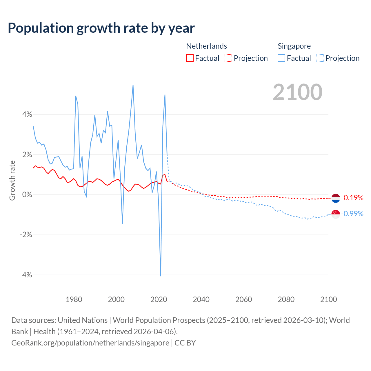 - For the last 10 years, the Netherlands has had an average growth rate of +0.62% per year vs +1.04% in Singapore.