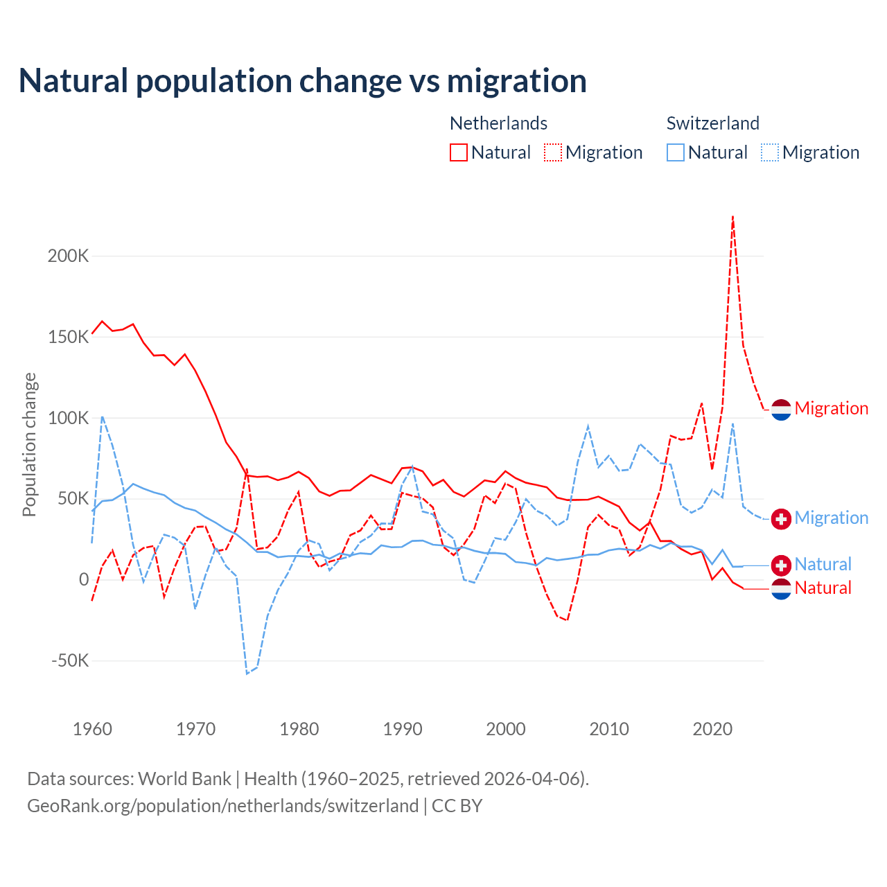 Over the last 10 years, 11.8% of the population change in the Netherlands is from natural causes (a gain of 134,554 people) and 88.2% is from migration (a gain of 1,006,495 people). In Switzerland 21.6% is from natural causes (a gain of 165,354 people) and 78.4% is from migration (a gain of 600,145 people).