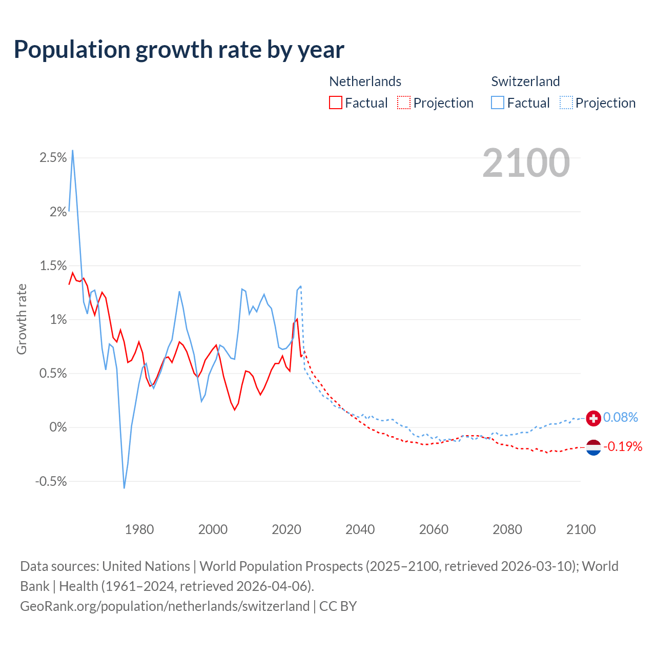 - For the last 10 years, the Netherlands has had an average growth rate of +0.62% per year vs +0.98% in Switzerland.