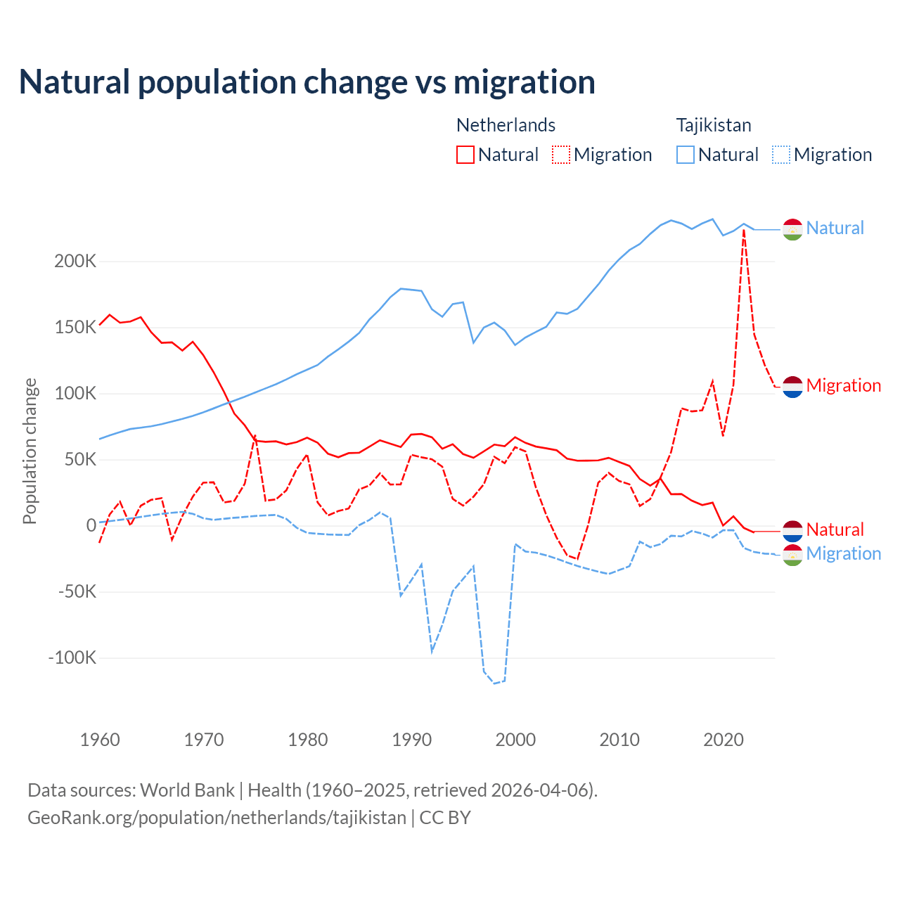 Over the last 10 years, 11.8% of the population change in the Netherlands is from natural causes (a gain of 134,554 people) and 88.2% is from migration (a gain of 1,006,495 people). In Tajikistan 96% is from natural causes (a gain of 2,266,045 people) and 3.95% is from migration (a loss of 93,205 people).