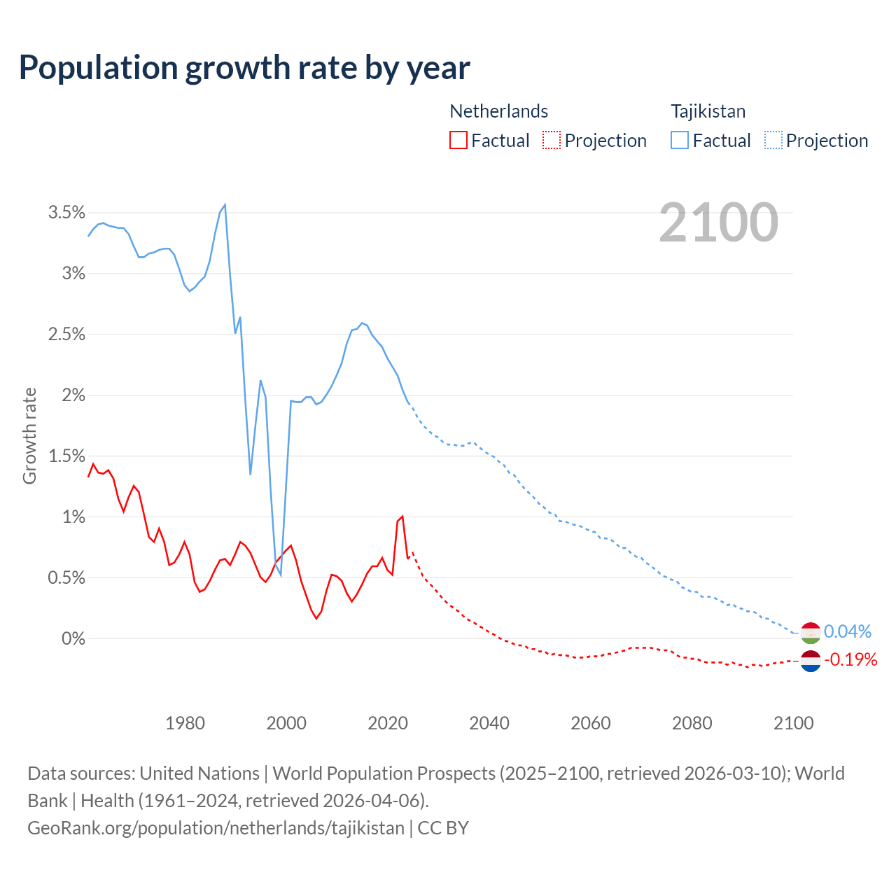 - For the last 10 years, the Netherlands has had an average growth rate of +0.62% per year vs +2.33% in Tajikistan.