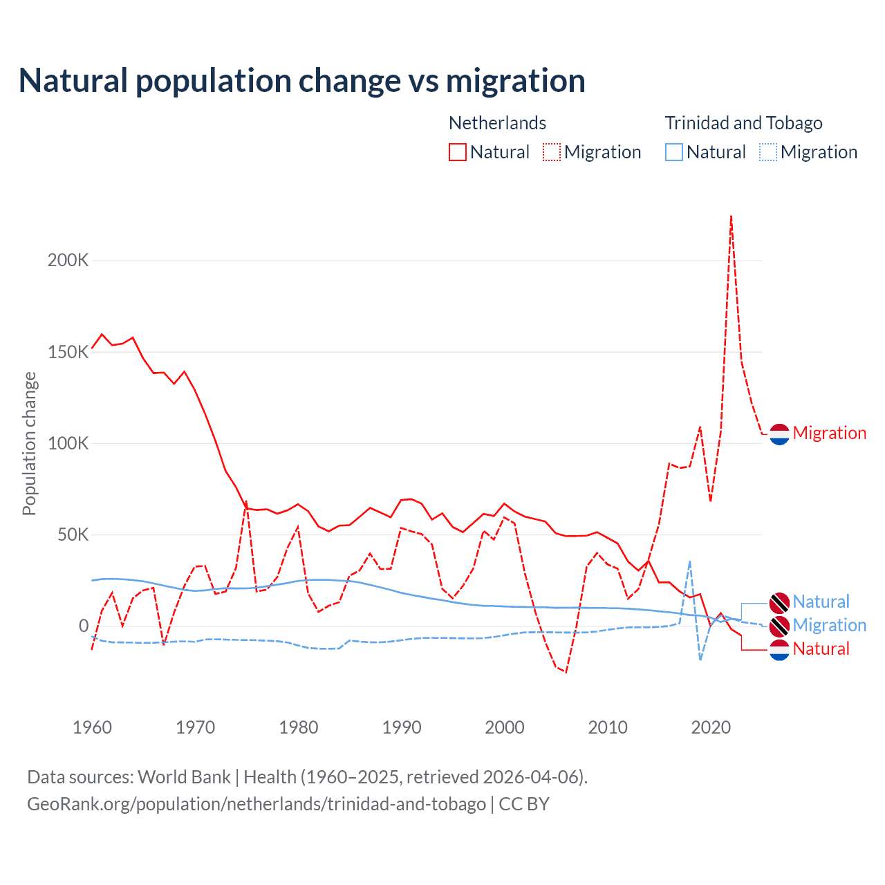 Over the last 10 years, 11.8% of the population change in the Netherlands is from natural causes (a gain of 134,554 people) and 88.2% is from migration (a gain of 1,006,495 people). In Trinidad and Tobago 66% is from natural causes (a gain of 55,887 people) and 34% is from migration (a gain of 28,785 people).