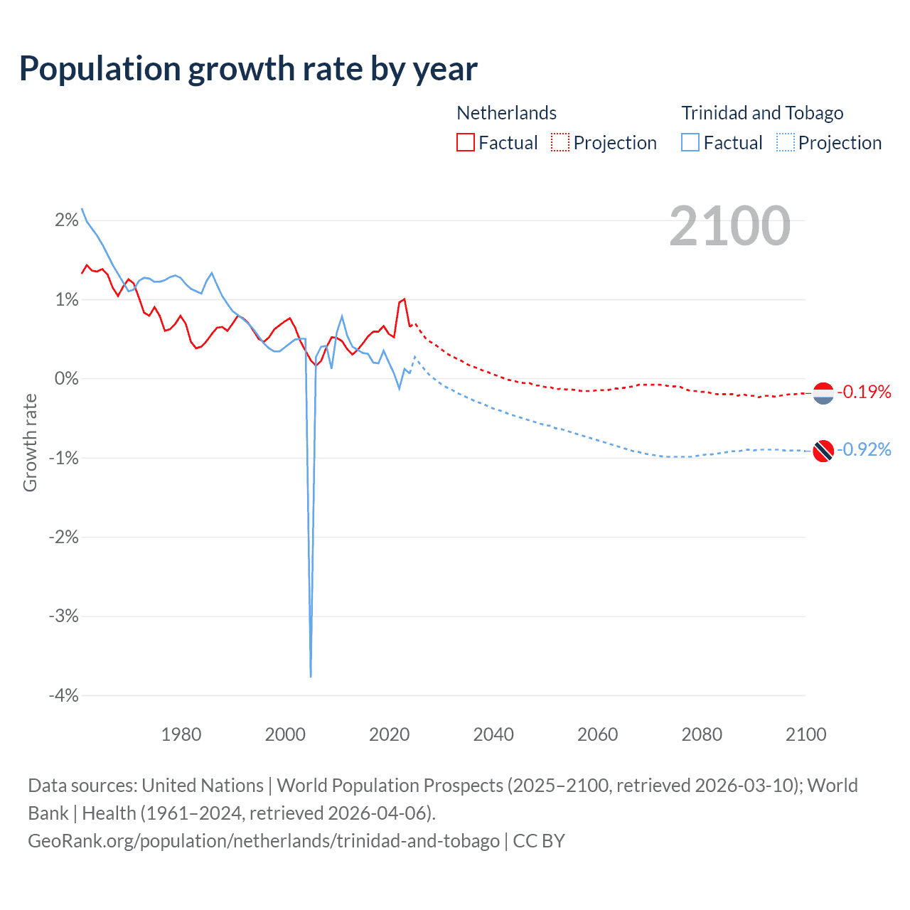 - For the last 10 years, the Netherlands has had an average growth rate of +0.62% per year vs +0.19% in Trinidad and Tobago.