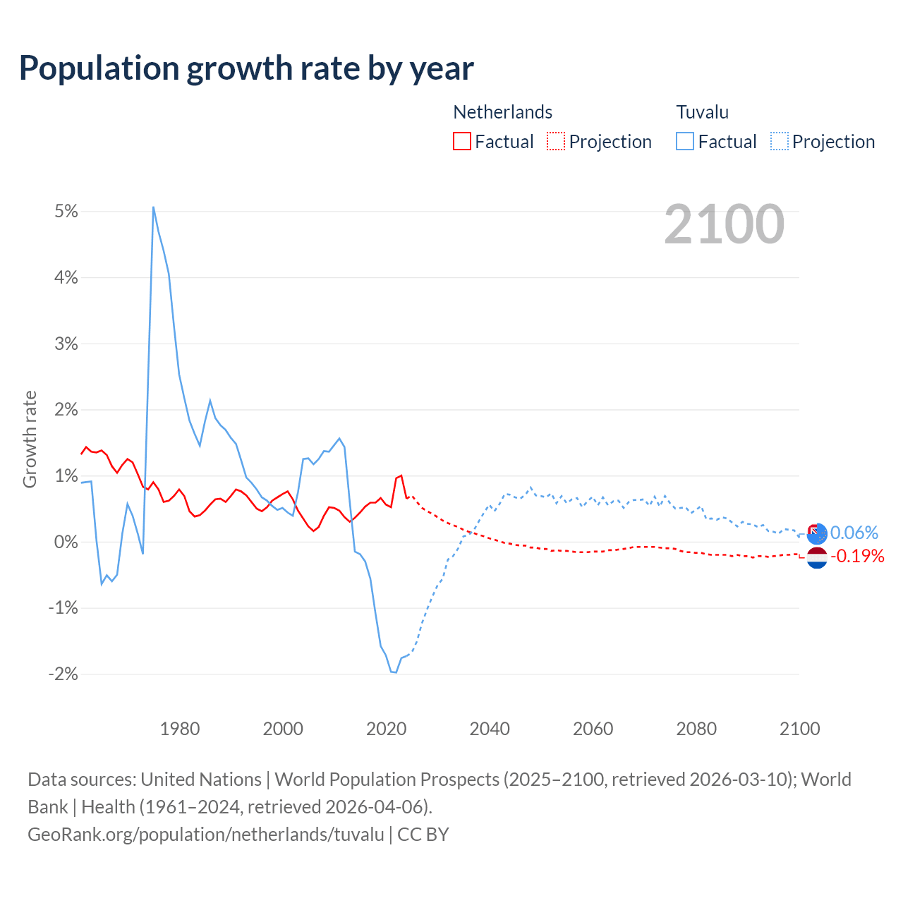- For the last 10 years, the Netherlands has had an average growth rate of +0.62% per year vs -1.19% in Tuvalu.
