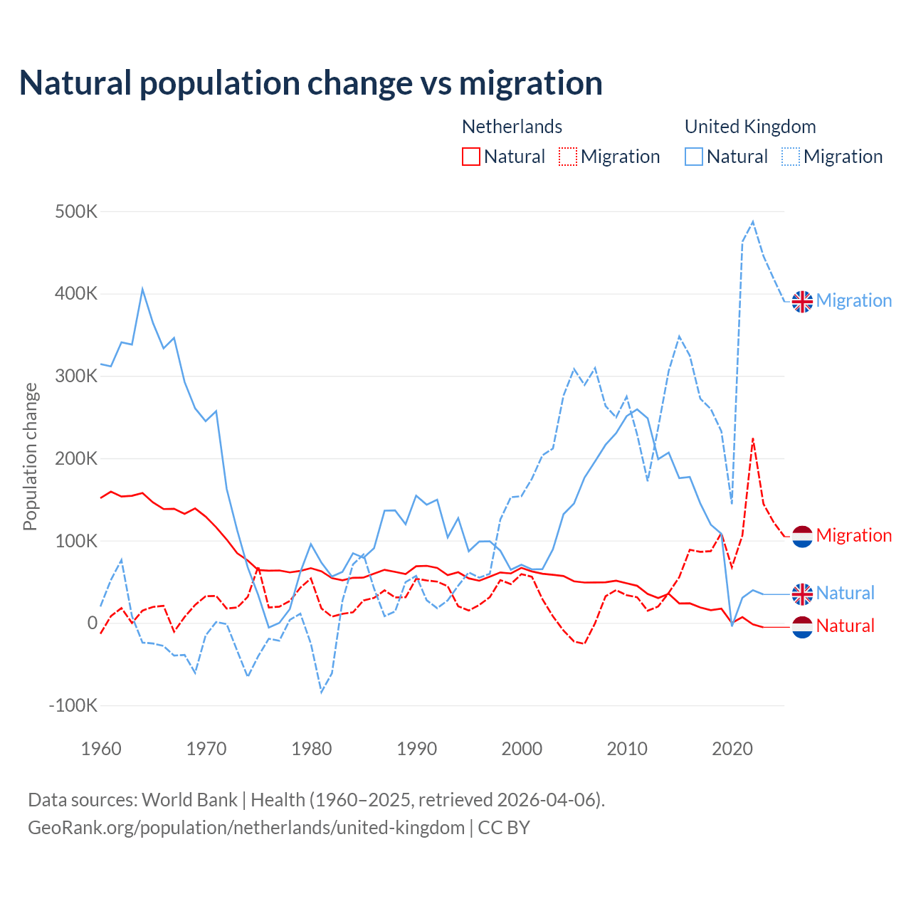 Over the last 10 years, 11.8% of the population change in the Netherlands is from natural causes (a gain of 134,554 people) and 88.2% is from migration (a gain of 1,006,495 people). In the United Kingdom 23.9% is from natural causes (a gain of 1,033,129 people) and 76.1% is from migration (a gain of 3,283,101 people).