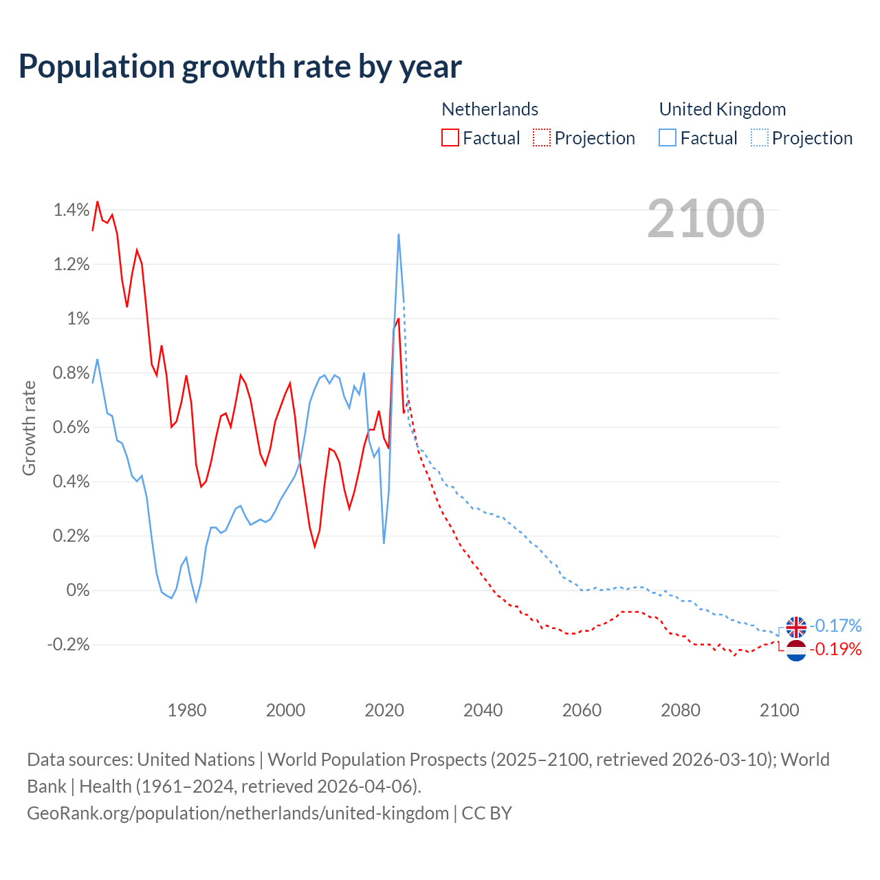 - For the last 10 years, the Netherlands has had an average growth rate of +0.62% per year vs +0.7% in the United Kingdom.