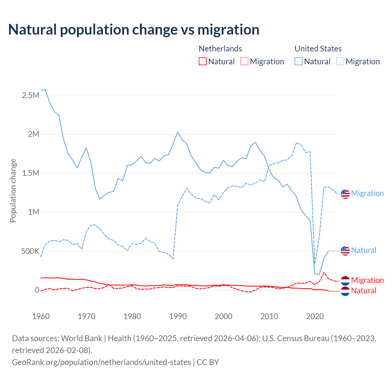 Over the last 10 years, 11.8% of the population change in the Netherlands is from natural causes (a gain of 134,554 people) and 88.2% is from migration (a gain of 1,006,495 people). In the United States 35.8% is from natural causes (a gain of 8,005,866 people) and 64.2% is from migration (a gain of 14,334,286 people).