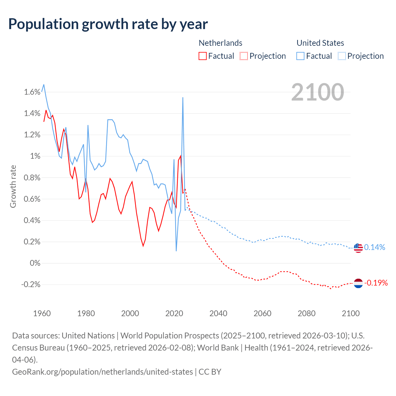 - For the last 10 years, the Netherlands has had an average growth rate of +0.62% per year vs +0.65% in the United States.