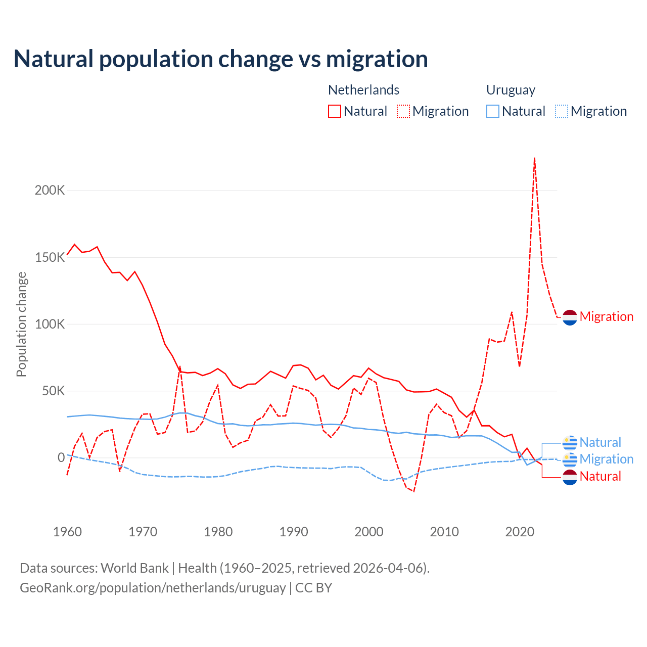 Over the last 10 years, 11.8% of the population change in the Netherlands is from natural causes (a gain of 134,554 people) and 88.2% is from migration (a gain of 1,006,495 people). In Uruguay 70% is from natural causes (a gain of 64,303 people) and 30% is from migration (a loss of 27,501 people).