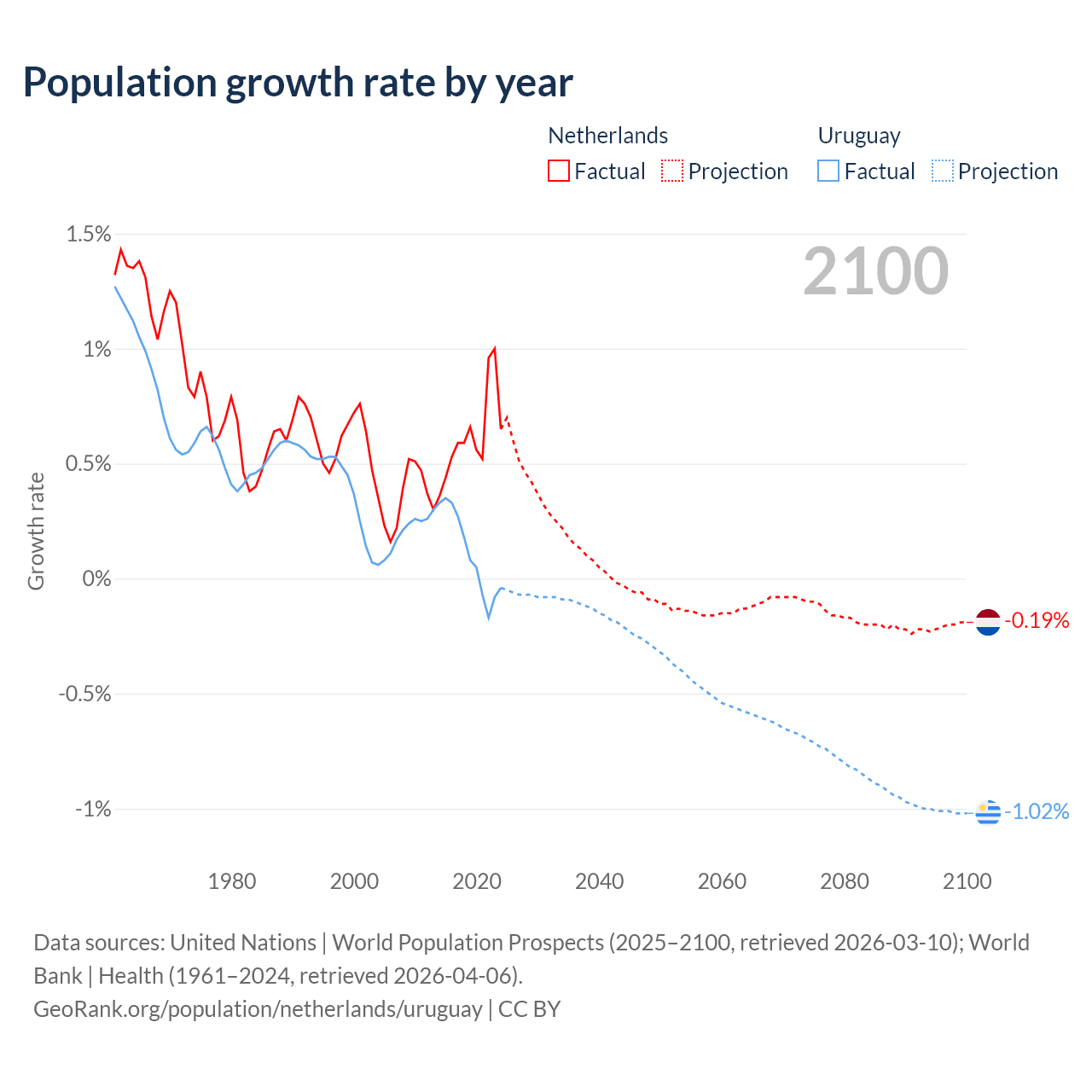 - For the last 10 years, the Netherlands has had an average growth rate of +0.62% per year vs +0.11% in Uruguay.