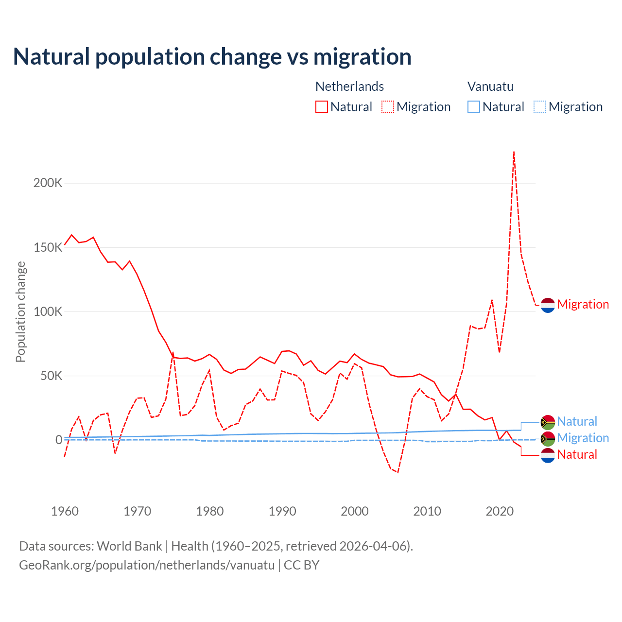 Over the last 10 years, 11.8% of the population change in the Netherlands is from natural causes (a gain of 134,554 people) and 88.2% is from migration (a gain of 1,006,495 people). In Vanuatu 92.2% is from natural causes (a gain of 72,941 people) and 7.81% is from migration (a loss of 6,181 people).